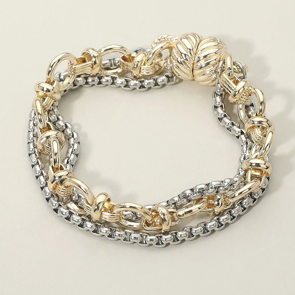 Details • Size : 0.7" H, 7" L • Magnetic Closure • Statement layered chain bracelet featuring a bold multi-link design with a secure magnetic closure for easy wear. Crafted for a modern stacked look, this versatile bracelet adds dimension and style to everyday outfits and trend-forward accessory collections. • Gold Dipped