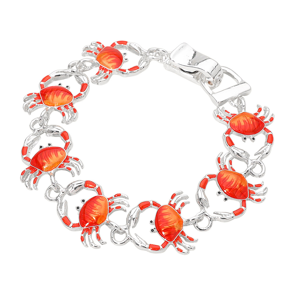 • Playful crab charm bracelet featuring detailed linked designs and a secure magnetic closure for easy wear. A fun ocean-inspired accessory ideal for beach boutiques, gift shops, and seasonal collections, offering eye-catching character, comfortable fit, and everyday coastal style appeal.
