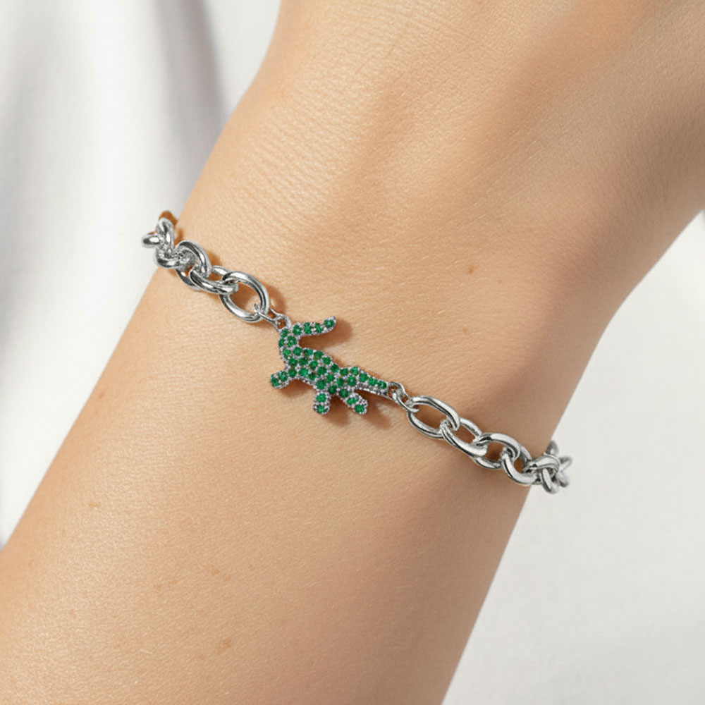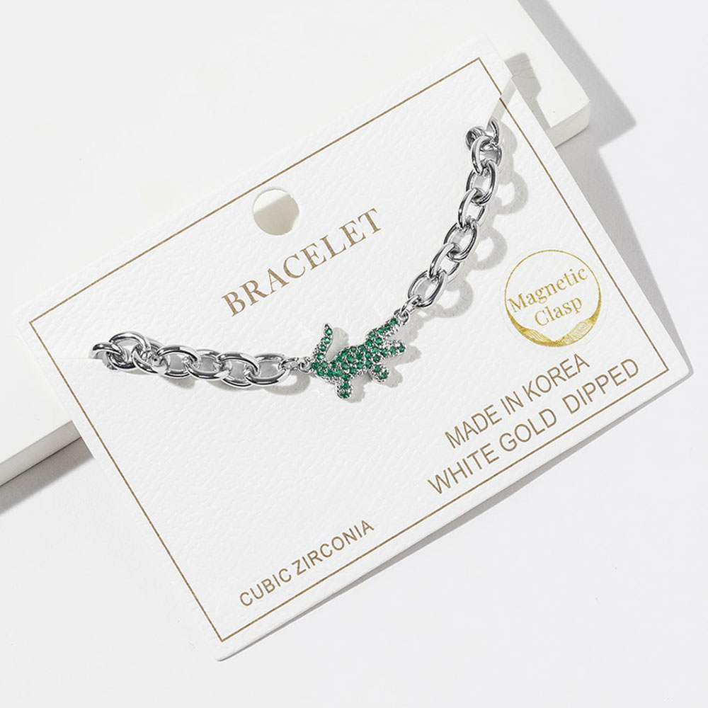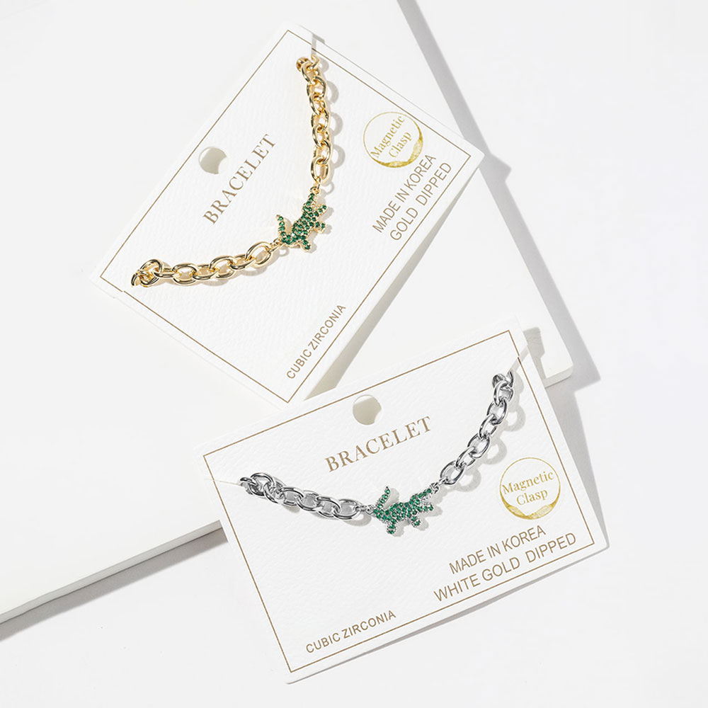 Details • Size : 0.5" H, 6.5" + 0.5" L • Magnetic Clasp Closure • This alligator charm chain bracelet features a bold animal inspired accent paired with a convenient magnetic clasp for easy wear. Designed to stand out while remaining versatile, it works well for everyday styling or statement layering. A strong addition to boutique assortments, themed collections, and gift focused displays that attract customers looking for playful yet stylish accessories. • Lead and Nickel Compliant • Made In Korea • Gold Dipped • CZ Cubic Zirconia