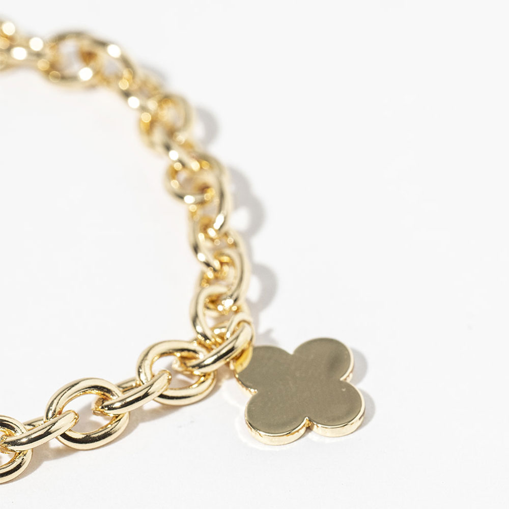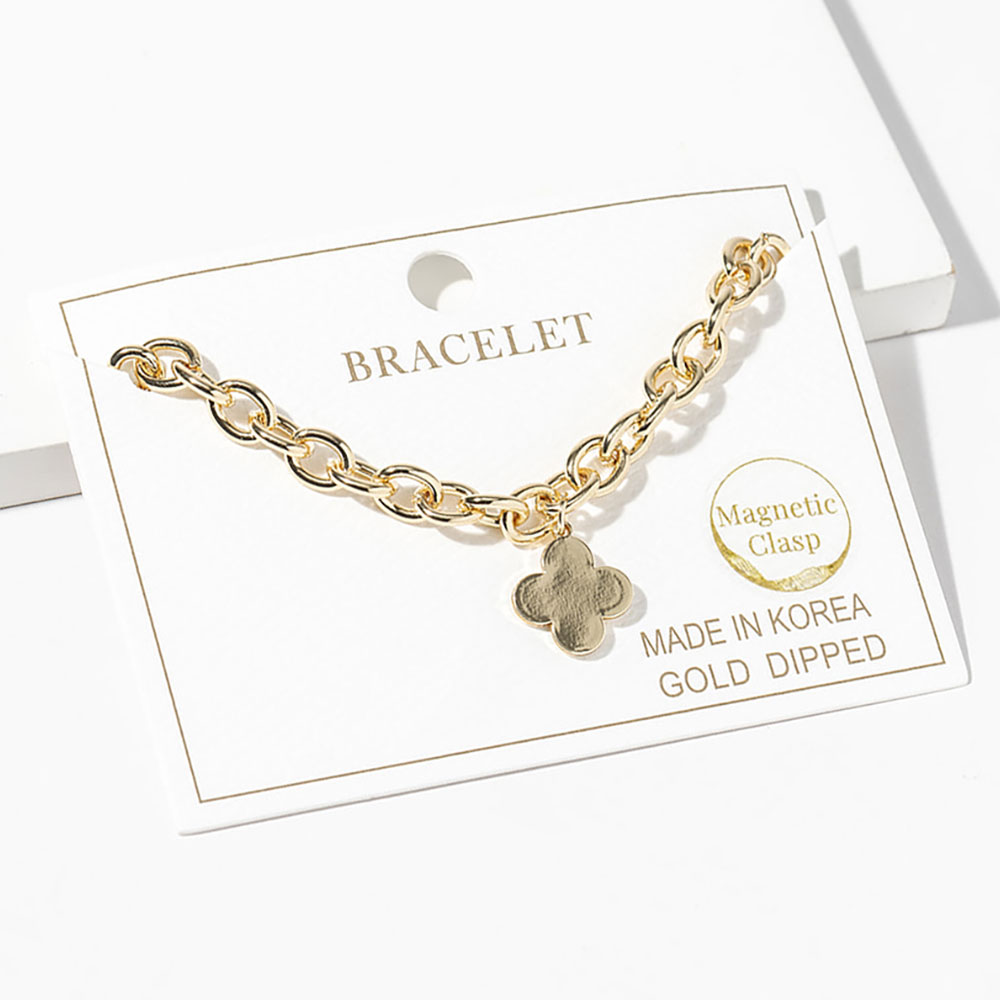 Details • Size : 0.25" H, 7.25" + 1" L • Charm Size : 0.5" X 0.5" • Magnetic Lobster Clasp Closure • Add a touch of elegance to your style with this chain bracelet featuring a chic quatrefoil charm pendant. The timeless design pairs effortlessly with any outfit, making it a perfect everyday accessory or thoughtful gift for someone special. • Gold Dipped • Lead and Nickel Compliant • Made In Korea