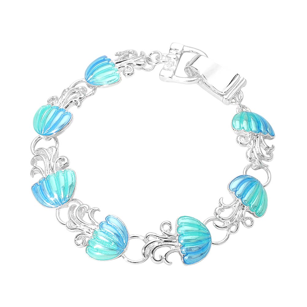 • This jellyfish charm bracelet showcases graceful jellyfish motifs linked with flowing details for an ocean-inspired statement. Designed for easy wear and comfortable styling, it adds playful movement to any look. Ideal for beach boutiques, resort collections, summer displays, and customers drawn to whimsical sea life jewelry with a unique, eye-catching appeal.