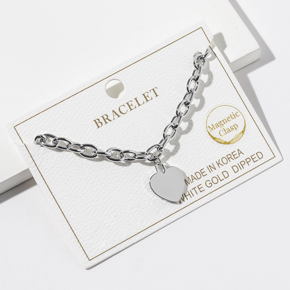Details • Size : 0.25" H, 7" + 1" L • Charm Size : 0.6" X 0.7" • Magnetic Clasp Closure • Chic chain bracelet featuring a smooth heart charm and a secure magnetic clasp for effortless wear. Its timeless design complements everyday looks and adds a delicate hint of romance to any outfit, making it a perfect piece to stack, style, or gift for special occasions. • Lead and Nickel Compliant • Made In Korea • Gold Dipped