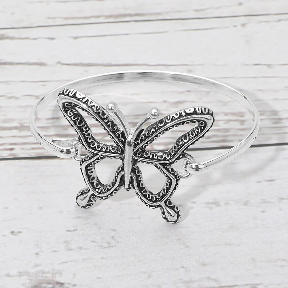 Details • Size : 1.3" H, 2.5" D • Hook Closure • This open bangle bracelet features a detailed butterfly centerpiece with sculpted contours that create a delicate yet eye-catching look. Designed for easy styling, it adds a graceful accent to everyday outfits or special occasion wear. Ideal for boutiques seeking symbolic jewelry that feels light, expressive, and versatile for layering or solo wear. • Lead and Nickel Compliant