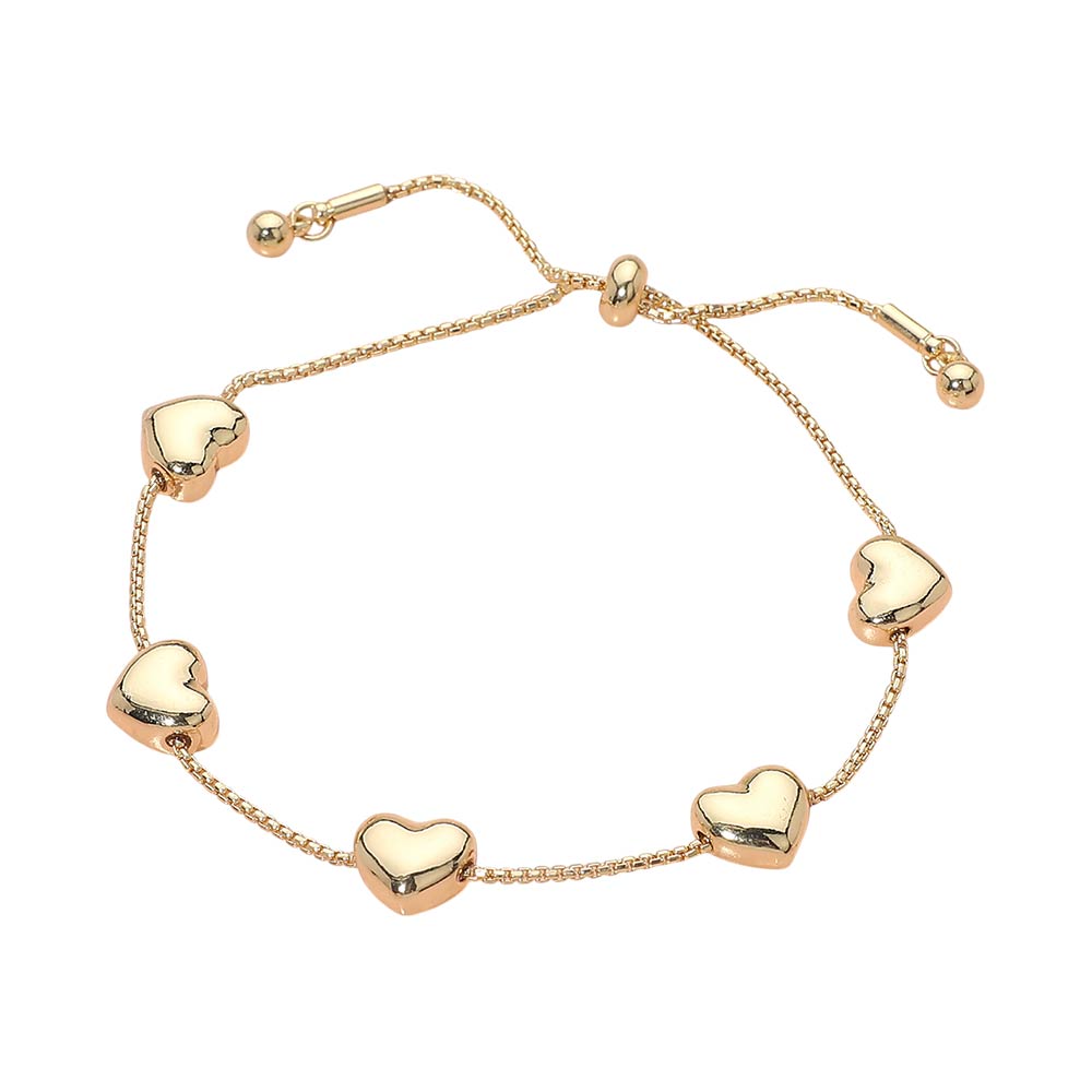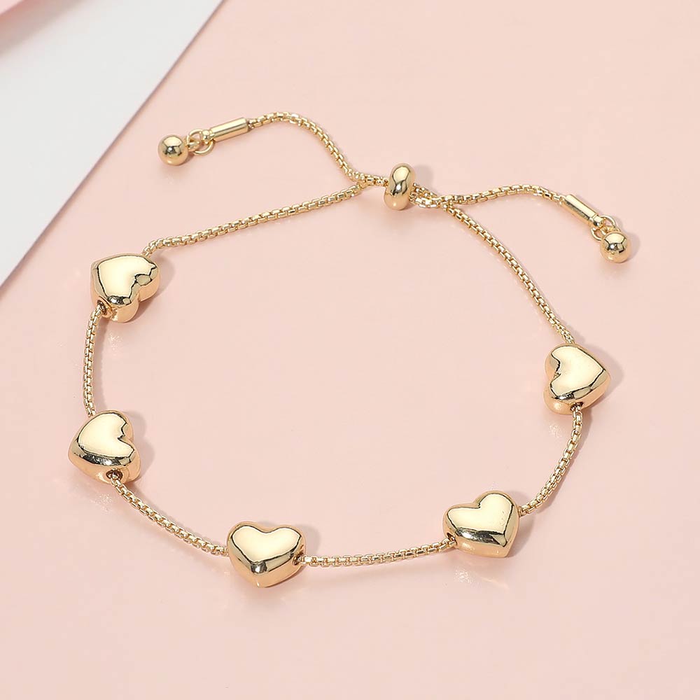 Details • Size : 0.3" H • Adjustable • Delicate adjustable bracelet featuring evenly spaced heart charms along a sleek chain. Designed for a comfortable fit and effortless styling, this bracelet adds a romantic, minimal touch to everyday looks. Ideal for layering or wearing solo, it’s a versatile choice for gifting, boutiques, and curated jewelry collections. • Lead and Nickel Compliant