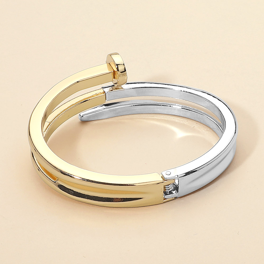 Details • Size : 1" H, 2.5" D • Hinged Closure • Contemporary double coil nail head bangle bracelet crafted with sleek curves for a bold, modern aesthetic. This stylish bracelet wraps elegantly around the wrist, offering a chic statement piece perfect for both casual and formal looks. A unique design that adds edge and sophistication to any outfit. • Lead and Nickel Compliant