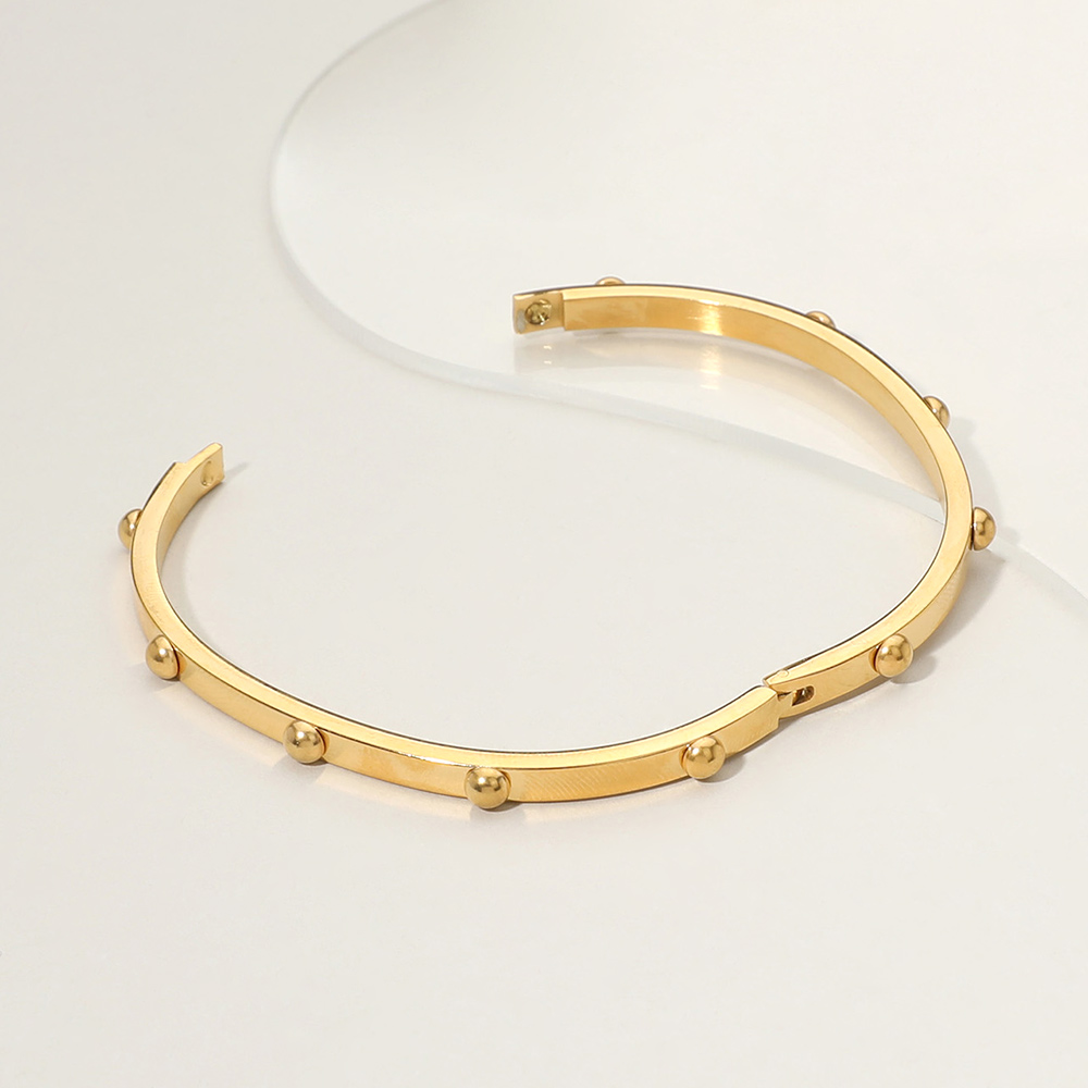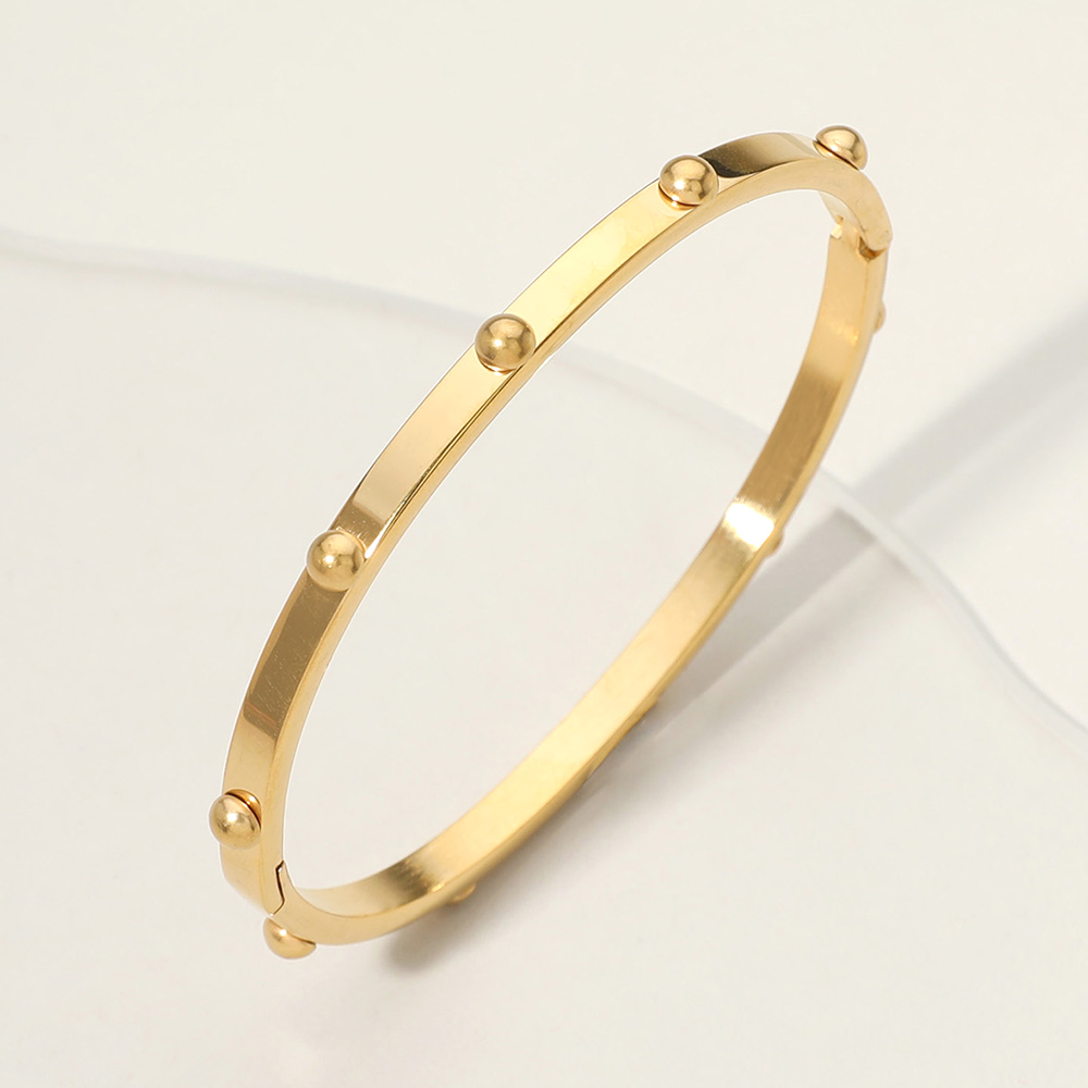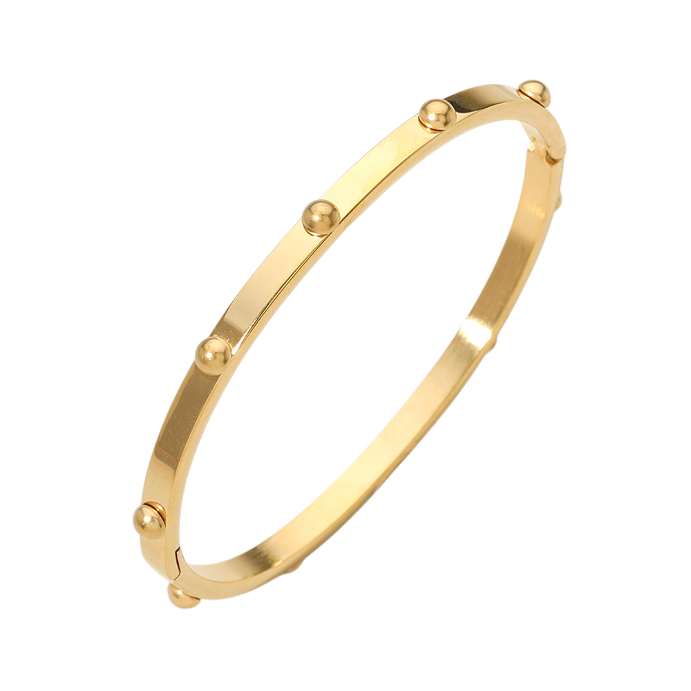 • Modern bangle bracelet featuring a polished finish with subtle stud accents for a stylish edge. Perfect for stacking or wearing solo, this versatile accessory adds sophistication and contemporary flair to both casual and formal outfits.