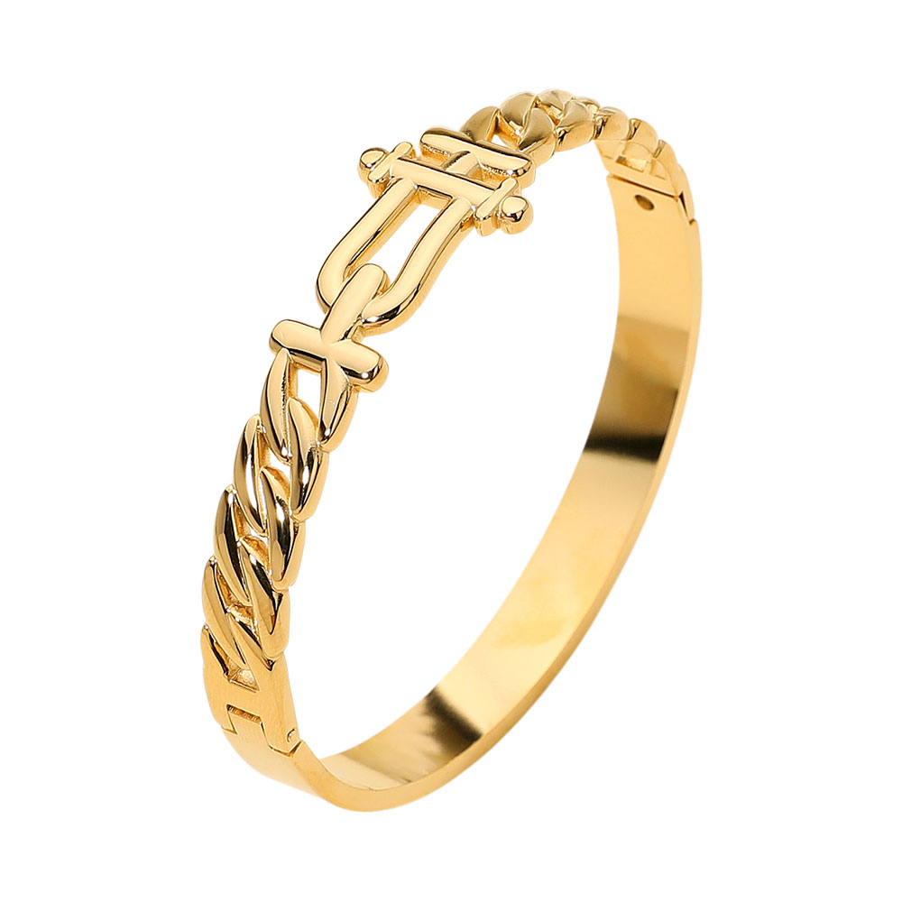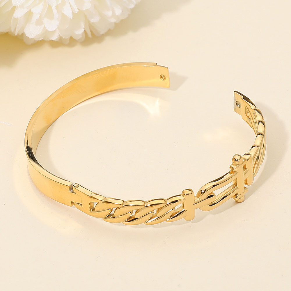 Details • Size : 0.6" H, 2.4" D • Hinged Closure • Water & Tarnish Resistant • A sleek hinged bangle featuring a refined chain-style accent for a modern, sculptural profile. Designed for easy wear with a secure closure, this bracelet adds subtle statement appeal that layers effortlessly or stands alone to elevate everyday and special-occasion looks. • Stainless Steel