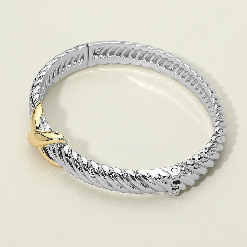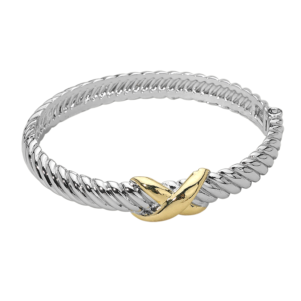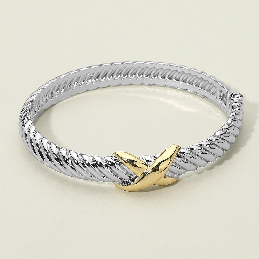 Details • Size : 0.5" H, 2.3" D • Hinged Closure • Elegant twist bangle bracelet featuring a sleek crossover accent that adds a refined detail to its bold, sculpted design. Perfect for stacking or wearing solo, this bracelet transitions effortlessly from daywear to evening elegance with timeless style.