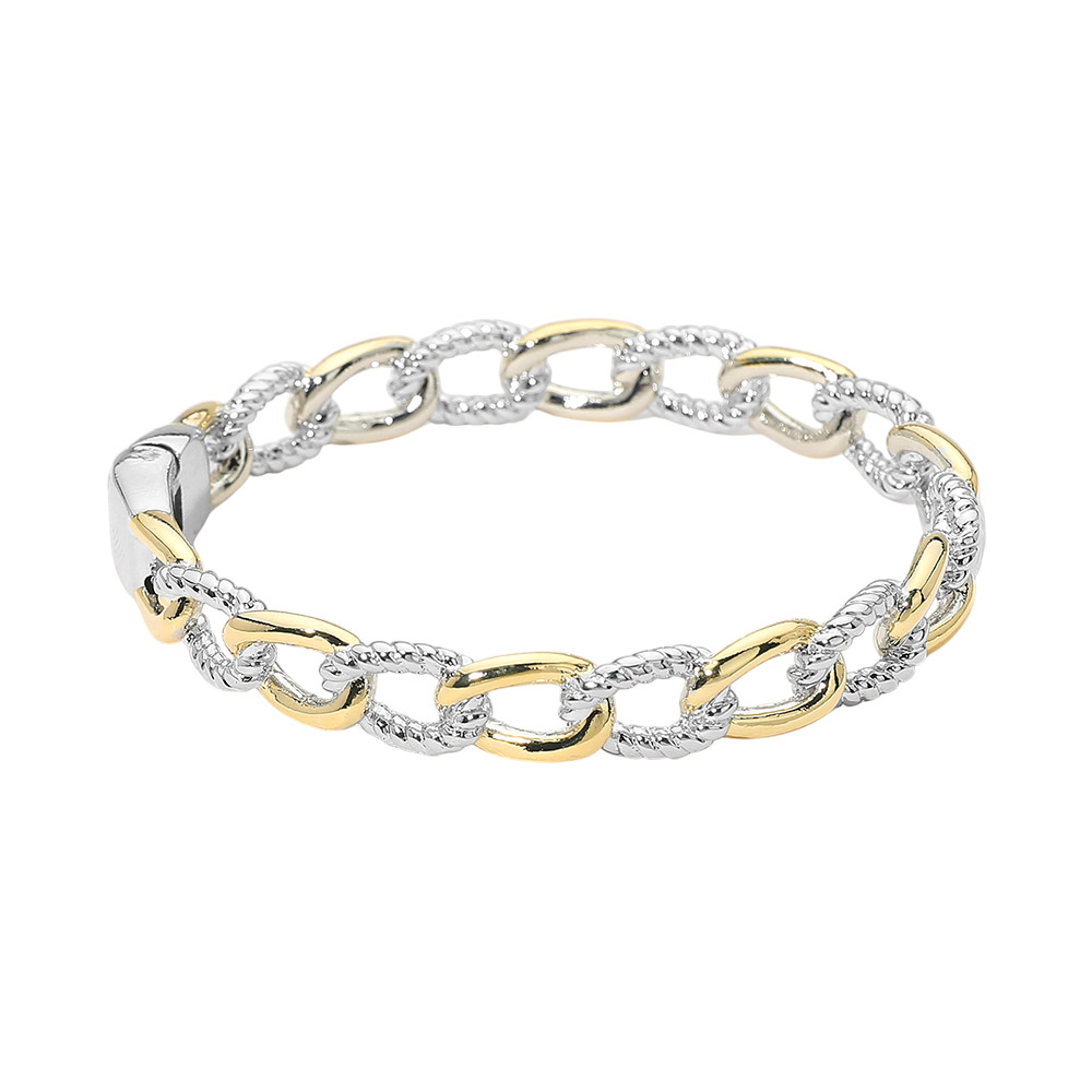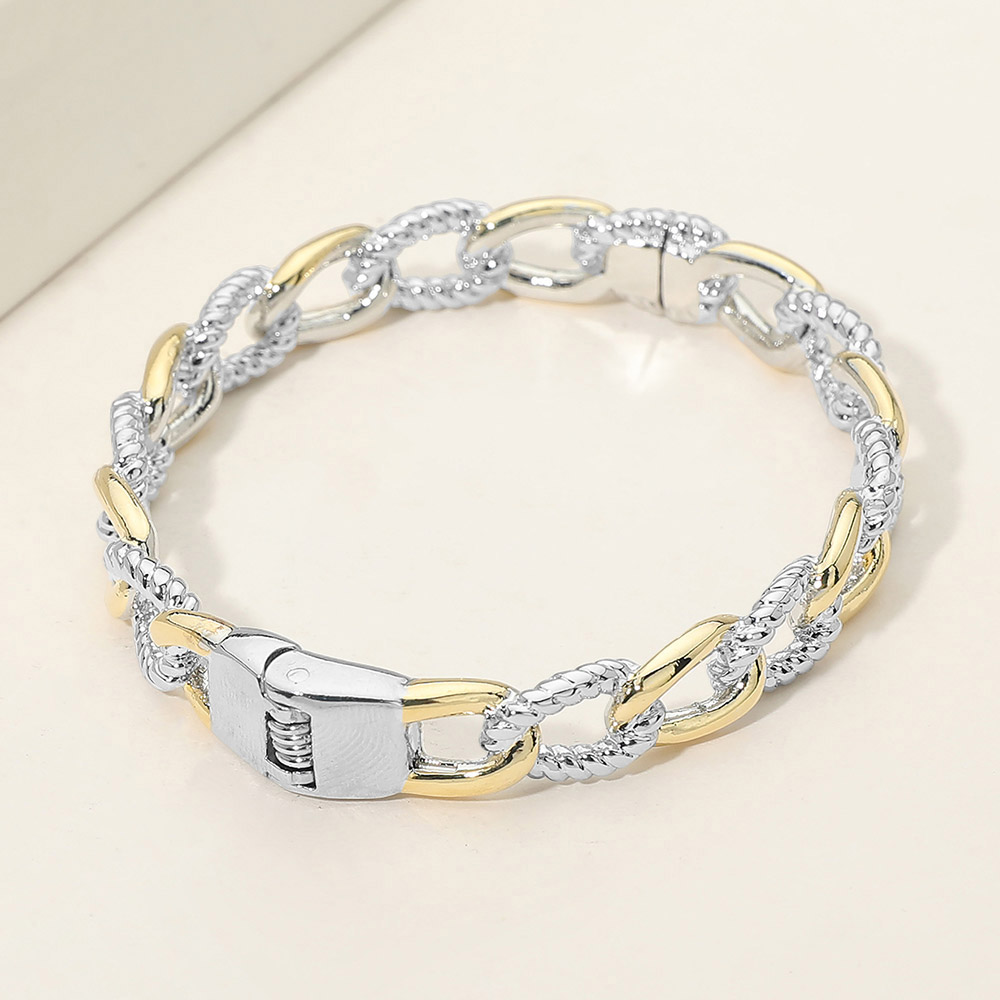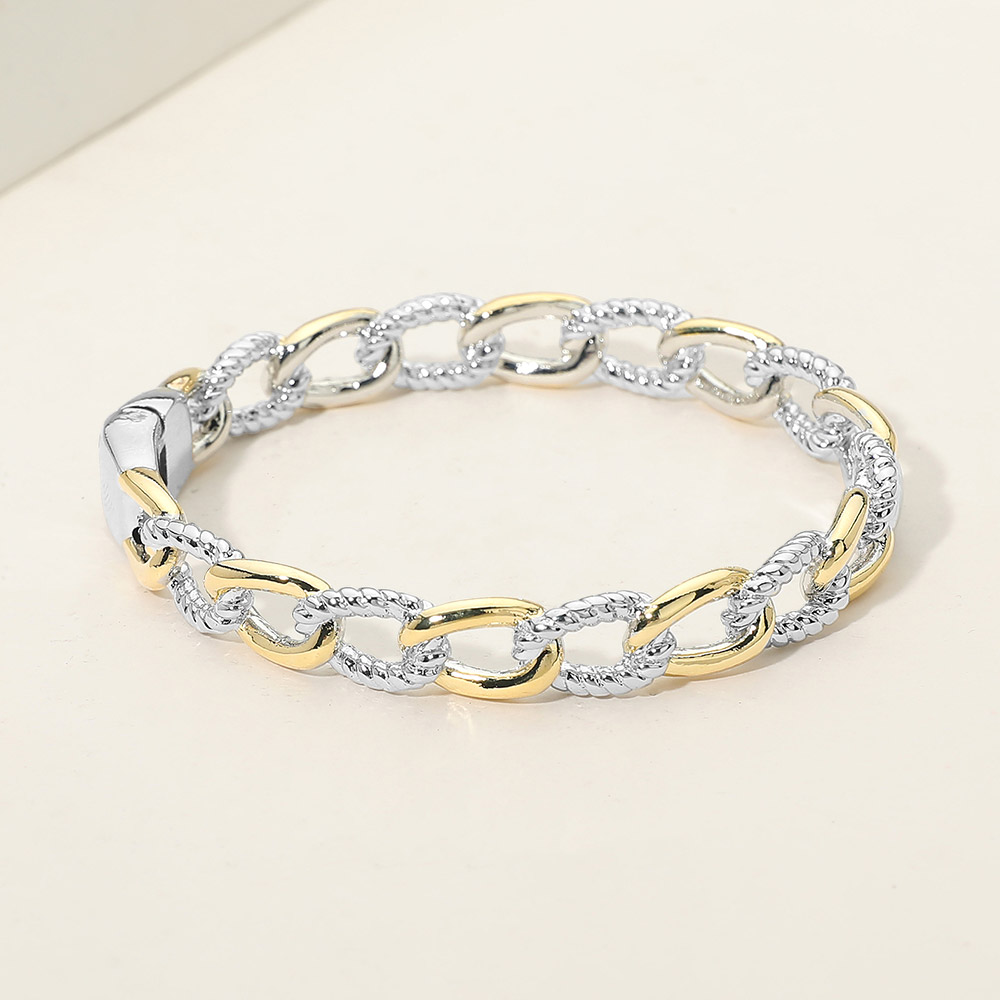 Details • Size : 0.3" H, 2.3" D • Hinged Closure • Modern chain bracelet designed with alternating smooth and textured links for a bold yet balanced look. Structured silhouette offers comfortable wear and secure closure, making it ideal for everyday styling or layering with other pieces. A versatile accessory perfect for boutiques seeking refined, contemporary jewelry.