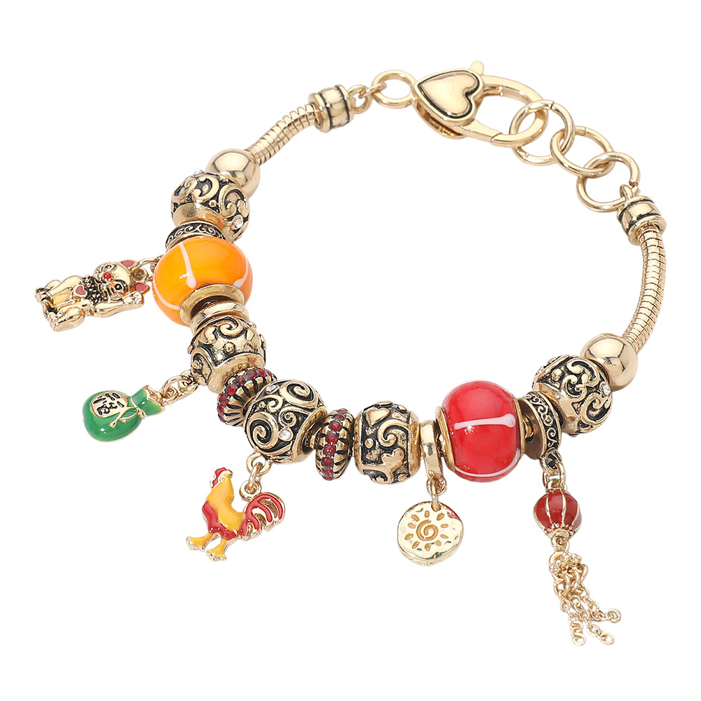 Cat Lucky Bag Rooster Sun Chain Charm Multi Bead Bracelet