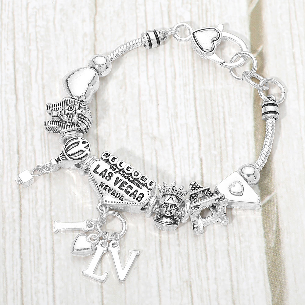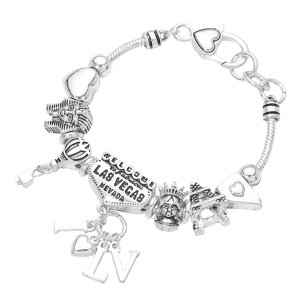 • Eye catching Las Vegas themed charm bracelet featuring iconic city symbols and heart accents. Designed to add personality and travel inspired flair to any outfit. A fun statement accessory ideal for gifting, souvenirs, or everyday wear with layered or solo styling.