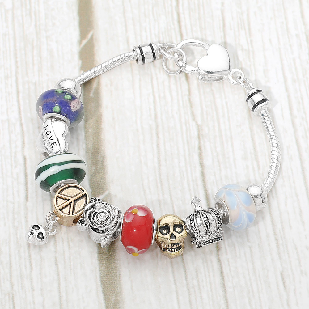 Details • Size : 0.6" H, 8" L • Lobster Clasp Closure • Unique multi charm bracelet featuring symbolic motifs such as peace, love, crown, rose, and skull accents. Designed to express individuality and layered meaning, this statement accessory adds personality to everyday outfits and makes a thoughtful gift for trend focused customers. • Lead and Nickel Compliant