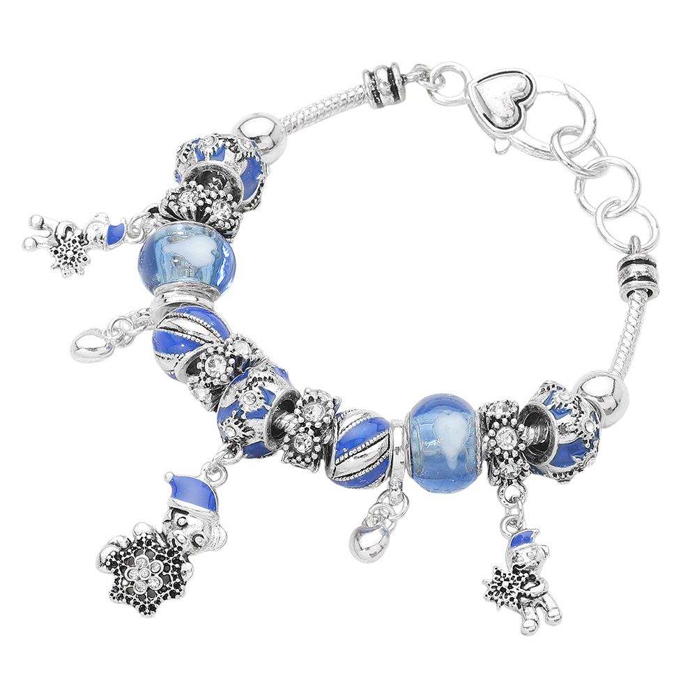 Details • Size : 1.6" L, 7.5" + 1" L • Lobster Closure • Seasonal charm bracelet designed with winter inspired motifs, decorative beads, and playful dangling accents. Created to add festive character and charm to everyday styling, this statement accessory is ideal for gifting, holiday outfits, or layering with other bracelets for a cheerful look. • Lead and Nickel Compliant