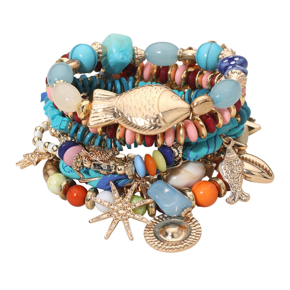 Details • Size 1 : 2" H / Stretchable • Size 2 : 0.3" H / Adjustable • Boho beach charm bracelet set featuring layered stretch strands with fish, seashell, and star accents, smooth and textured beads, and unique shapes for a playful coastal style. Perfect for stacking, gifting, and adding a fun ocean-inspired touch to everyday outfits and vacation looks. • Lead and Nickel Compliant • Made In India
