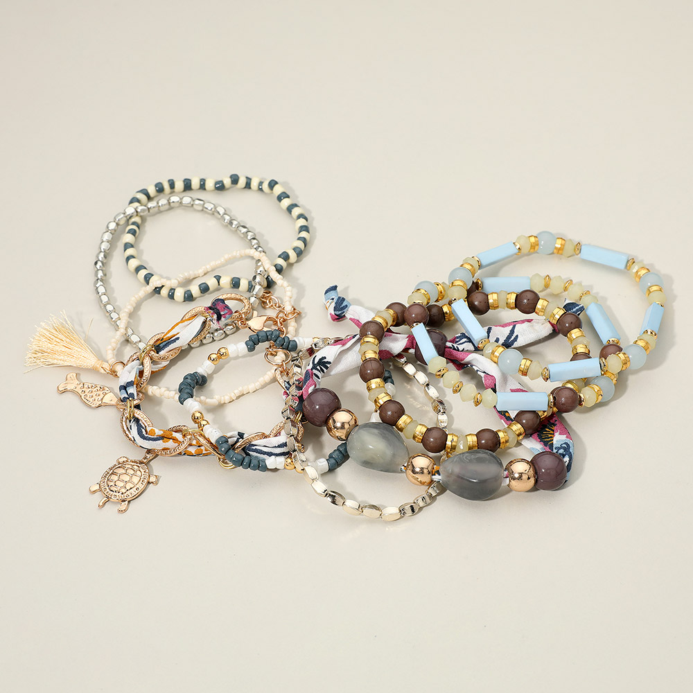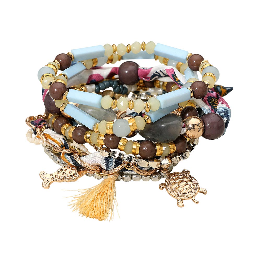 Details • Size 1 : 1.4" H / Stretchable • Size 2 : 0.7" H / Adjustable • Size 3 : 0.4" H, 7" + 2" L / Lobster Clasp Closure • Boho turtle fish tassel charm bracelet set featuring layered beaded strands, fabric-wrapped details, tassel accent, and playful ocean-themed charms for a stylish handmade look. Perfect for stacking, casual outfits, vacations, beach style, and gifting, adding a relaxed coastal vibe to everyday fashion. • Lead and Nickel Compliant • Made In India