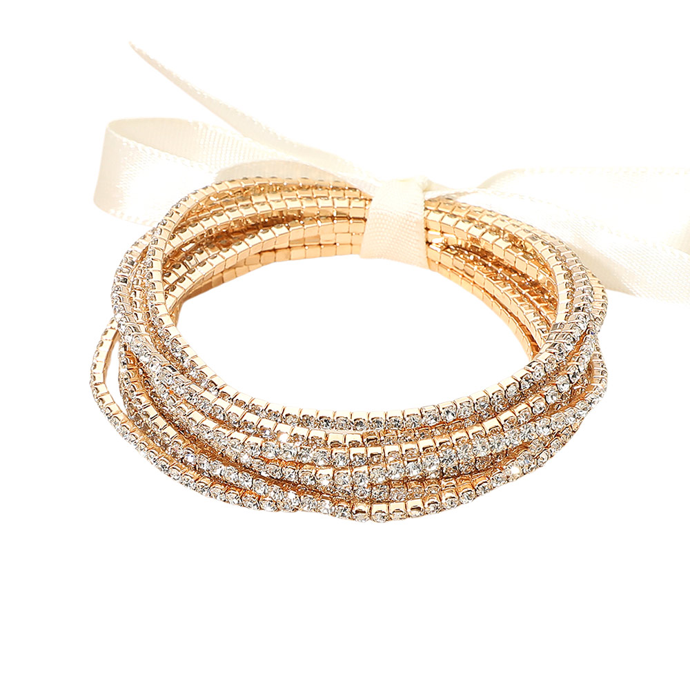 12PCS - Ribbon Slim Rhinestone Stretch Multi Layered Bracelet