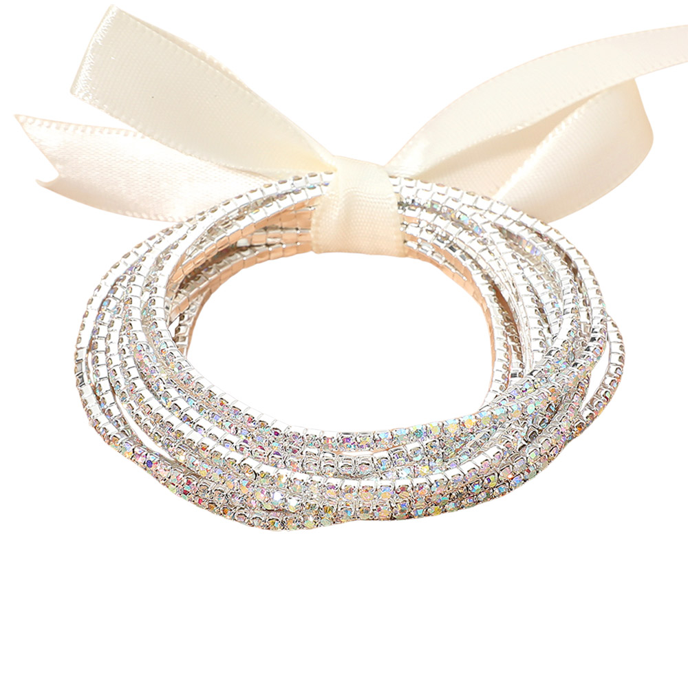 • Elegant layered stretch bracelet set featuring multiple slim bands tied together with a decorative ribbon. The stackable circular design adds texture and shine, perfect for both casual layering and festive occasions.