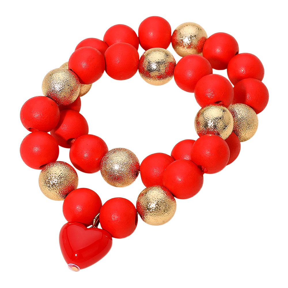 2PCS - Chunky Heart Charm Wooden Metal Ball Beaded Stretch Multi Layered Bracelets
