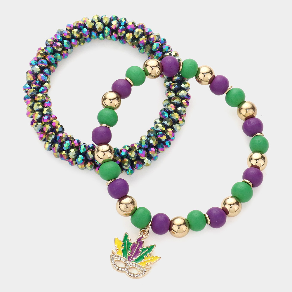 2PCS - Mardi Gras Mask Charm Wood Ball Faceted Beaded Stretch Bracelets