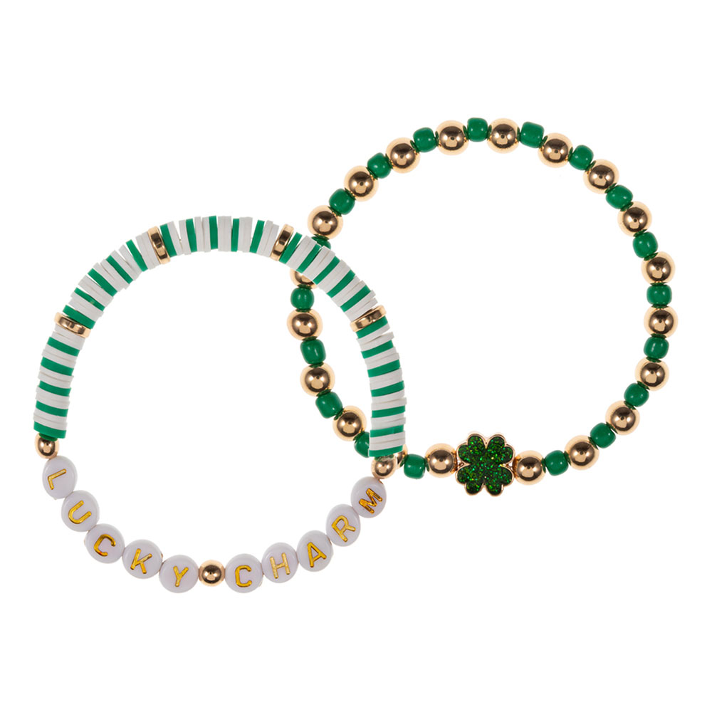 Details • Size : 0.7" H • Stretchable • Playful stretch bracelet featuring mixed bead textures, letter accents, and a lucky charm centerpiece. Designed for easy wear and effortless stacking, this fun accessory adds personality to casual outfits, holiday edits, boutique gift displays, and trend-driven jewelry collections. Perfect for everyday styling and themed assortments. • Lead and Nickel Compliant