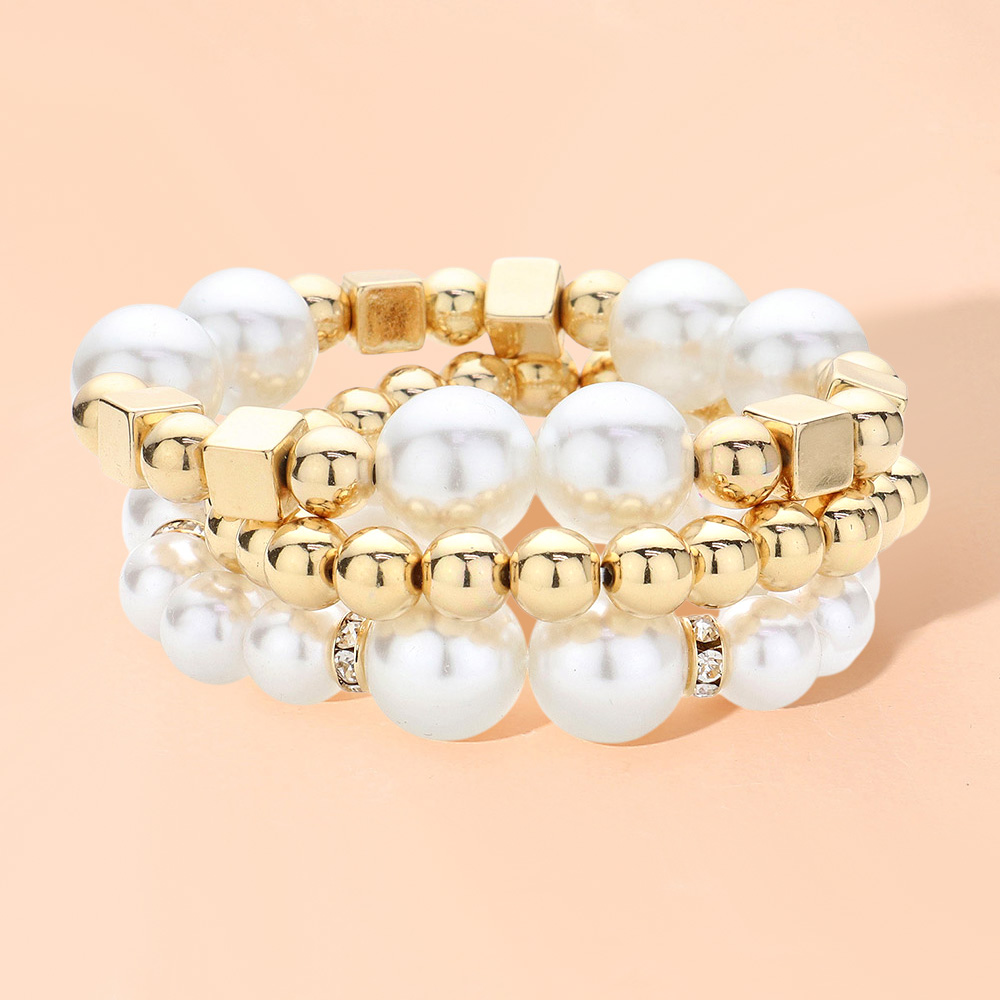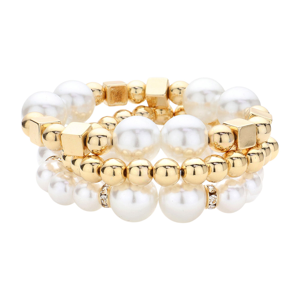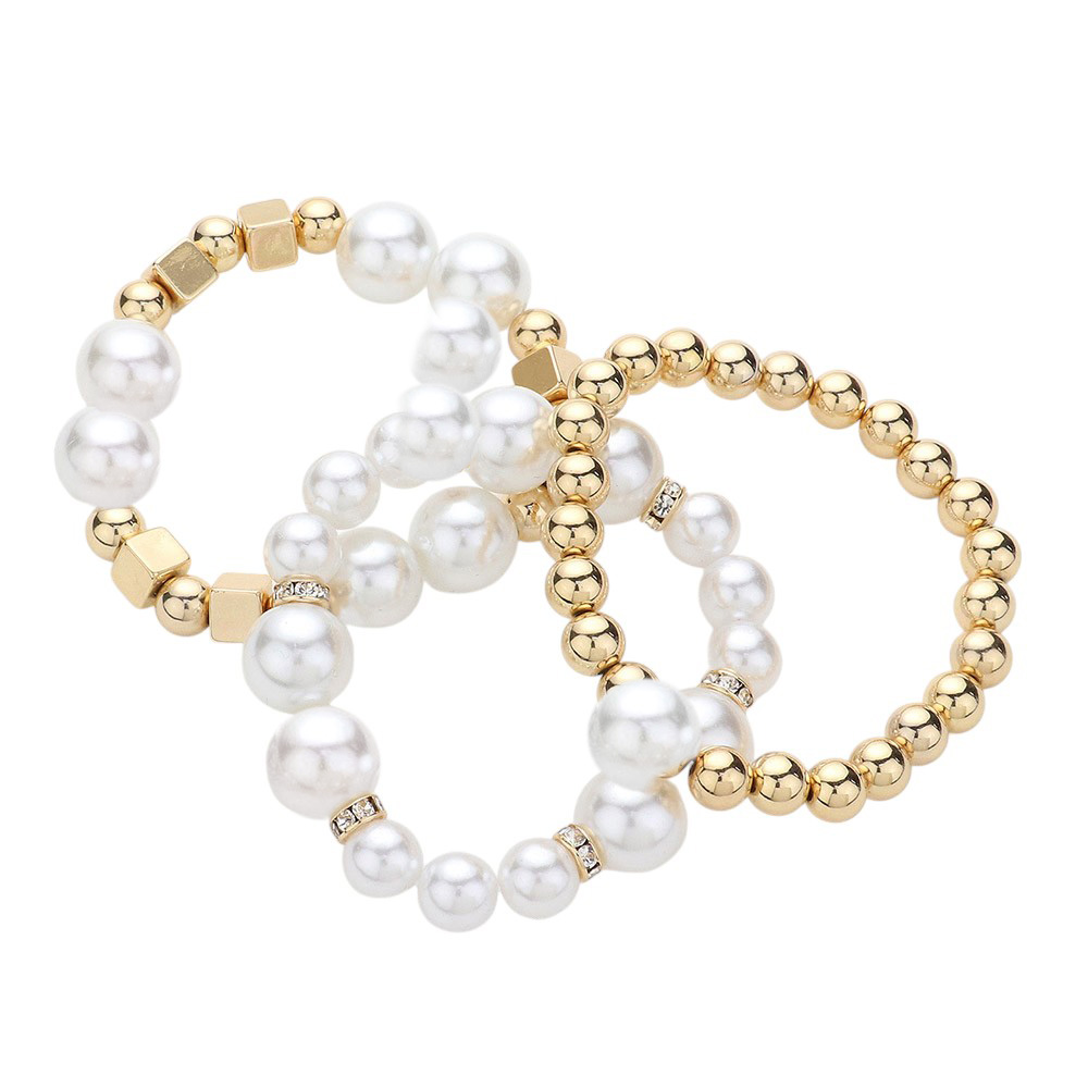 3PCS - Pearl Metal Ball Beaded Stretch Multi Layered Bracelets