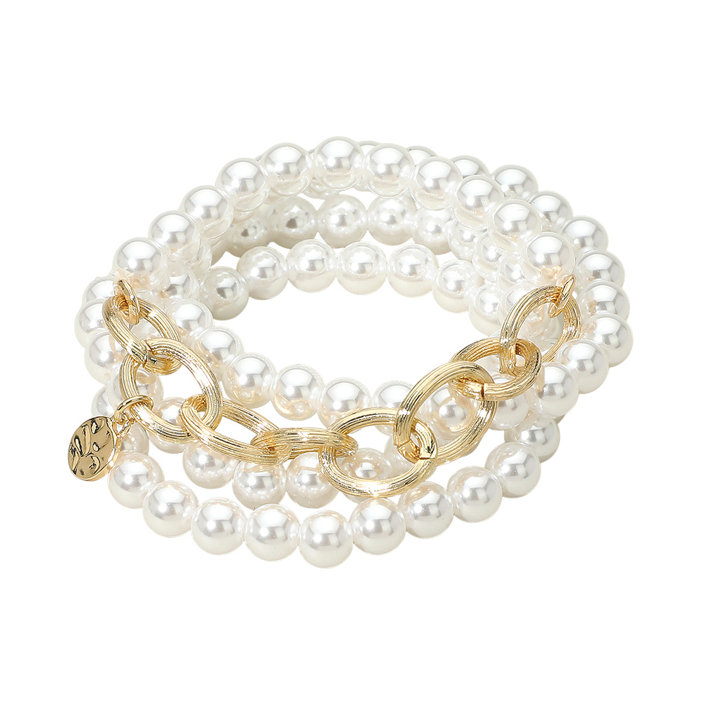 Details • Size : 1.25" H • Stretchable • Refine your look with this triple layer pearl and chain bracelet. Featuring elegant strands of glossy pearls intertwined with textured links, it exudes timeless charm and sophistication—perfect for pairing with formal wear or adding a chic accent to your everyday ensemble. • Lead and Nickel Compliant