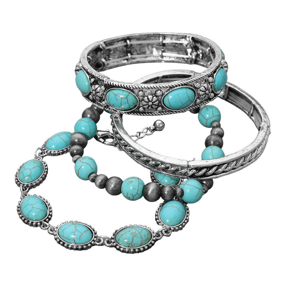 4PCS - Boho Oval Round Stone Embellished Stretch Multi Layered Bracelets