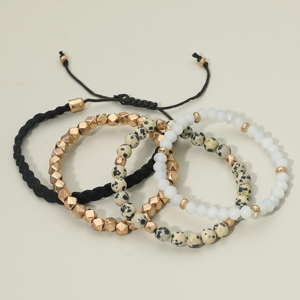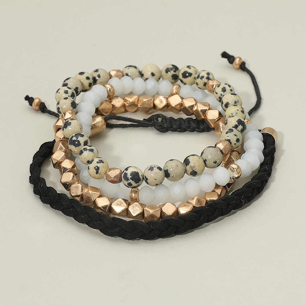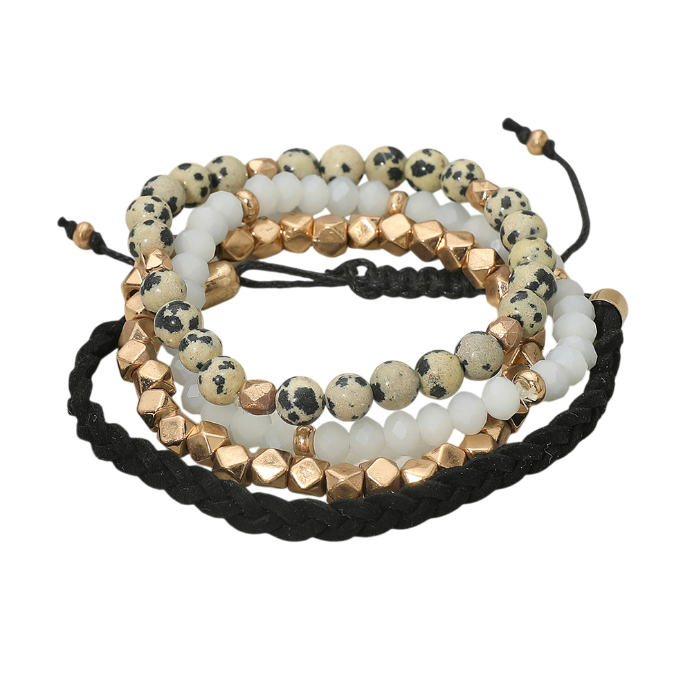 Details • Size 1 : 0.75" H, Stretchable • Size 2 : 0.25" H, Adjustable • This adjustable bracelet set features a unique mix of beaded strands, faceted accents, and braided cord, creating a stylish layered look. Designed for comfort and versatility, it easily complements casual and dressy outfits, making it a perfect everyday accessory. • Lead and Nickel Compliant