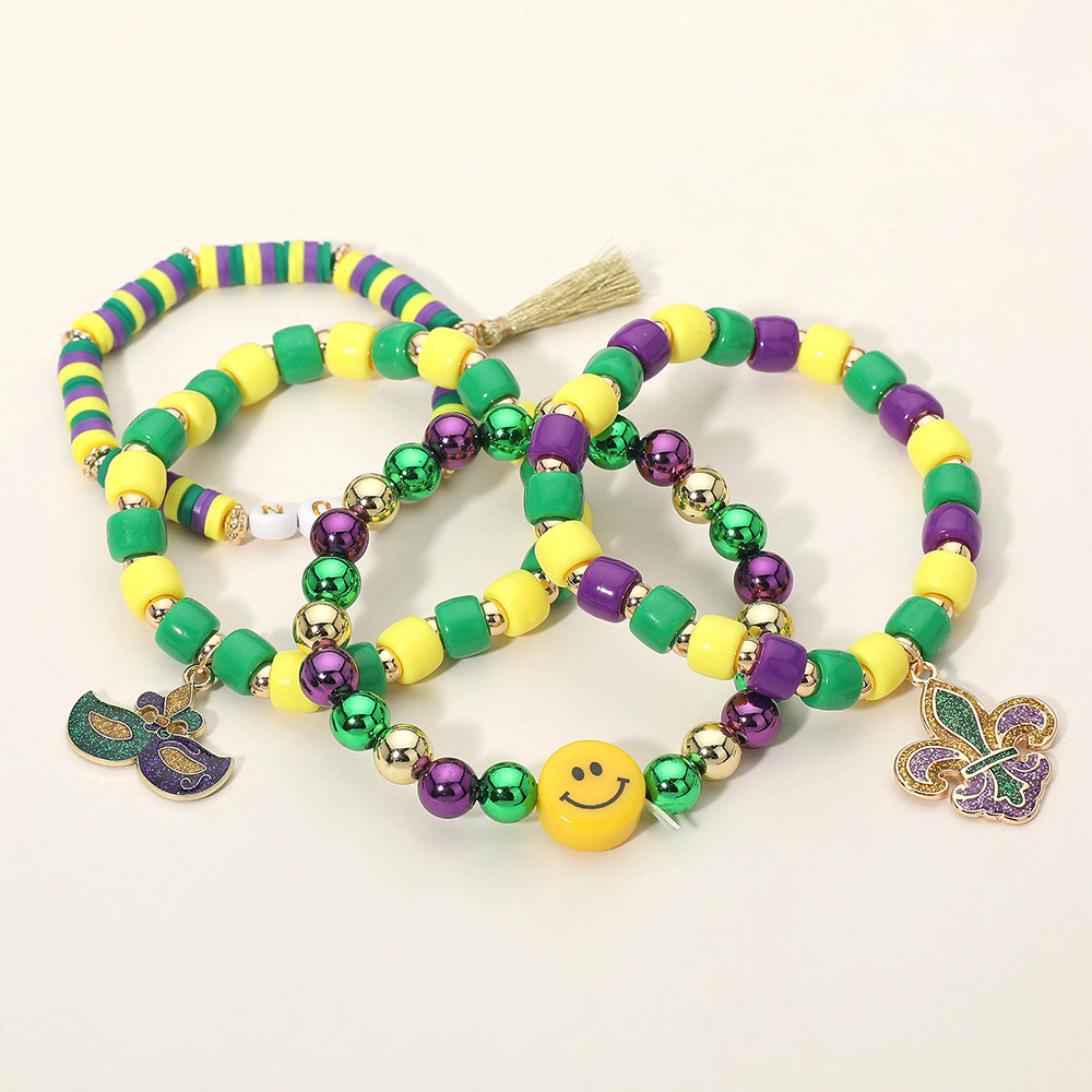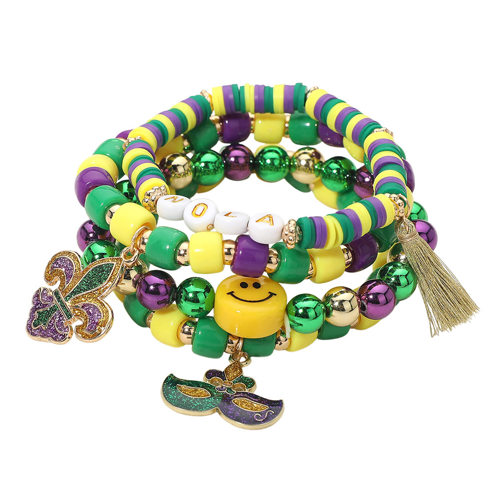 Details • Size : 1.5" H • Stretchable • This Mardi Gras charm beaded stretch bracelet set features playful bead designs accented with festive charms and fun focal details. Designed for comfortable stretch wear, each bracelet can be styled alone or stacked together, making it ideal for celebrations, themed events, party favors, and eye-catching seasonal accessory displays. • Lead and Nickel Compliant