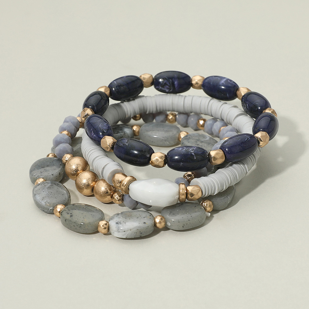 Details • Size : 1.5" H • Stretchable • This layered stretch bracelet set features a unique mix of smooth, faceted, and textured beads combined with metallic accents. Designed for easy wear and versatile styling, this multi-strand bracelet stack adds a bold yet elegant finishing touch to casual and dressy looks. • Lead and Nickel Compliant