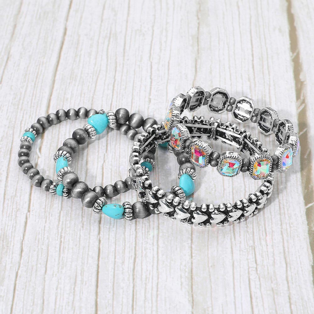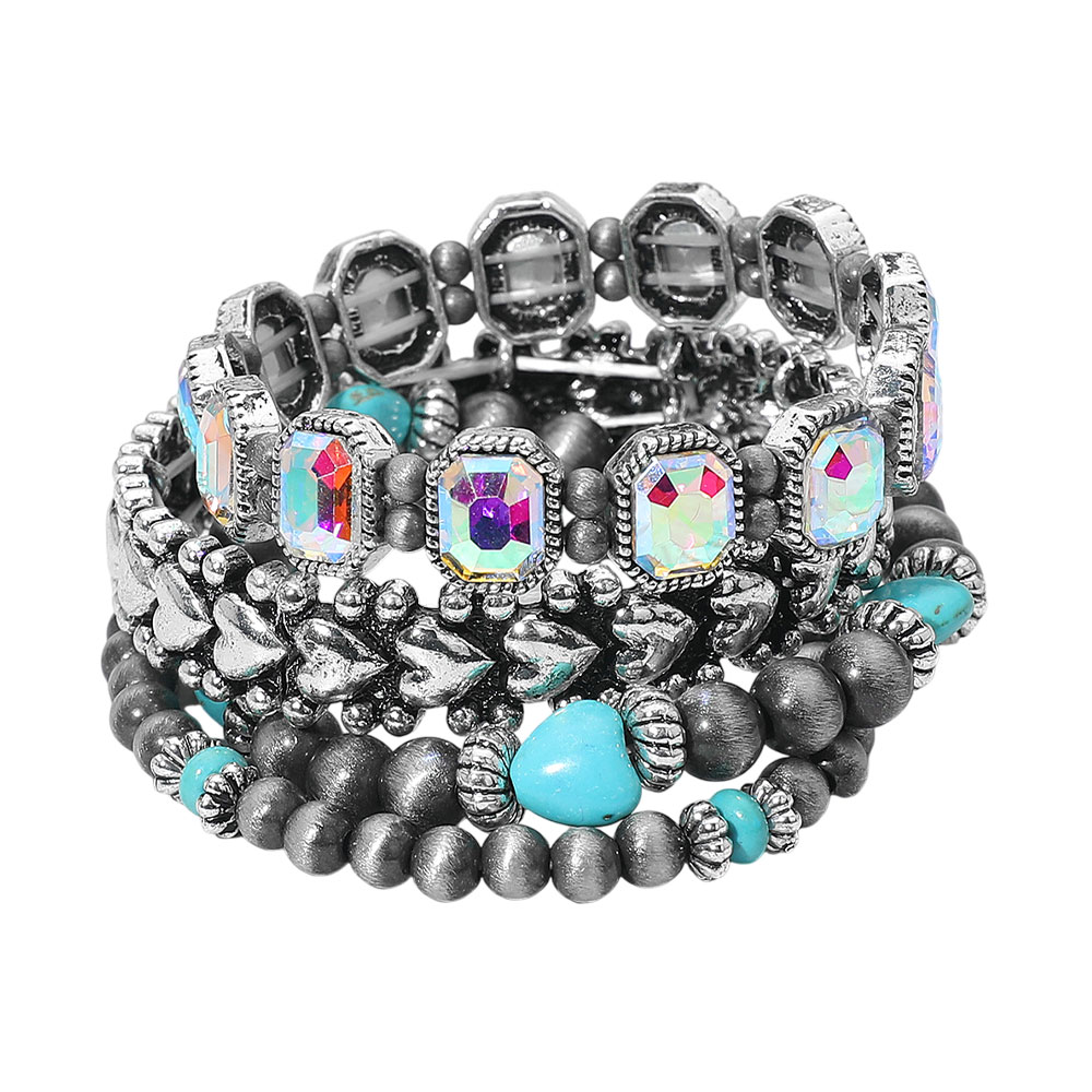 Details • Size : 1.75" H • Stretchable • This vintage-inspired stretch bracelet set features a mix of radiant faceted gems, metallic beads, and smooth accents for a striking layered effect. Its eclectic design combines bold sparkle with artisan charm, creating a versatile accessory perfect for casual or boho-chic looks. • Lead and Nickel Compliant