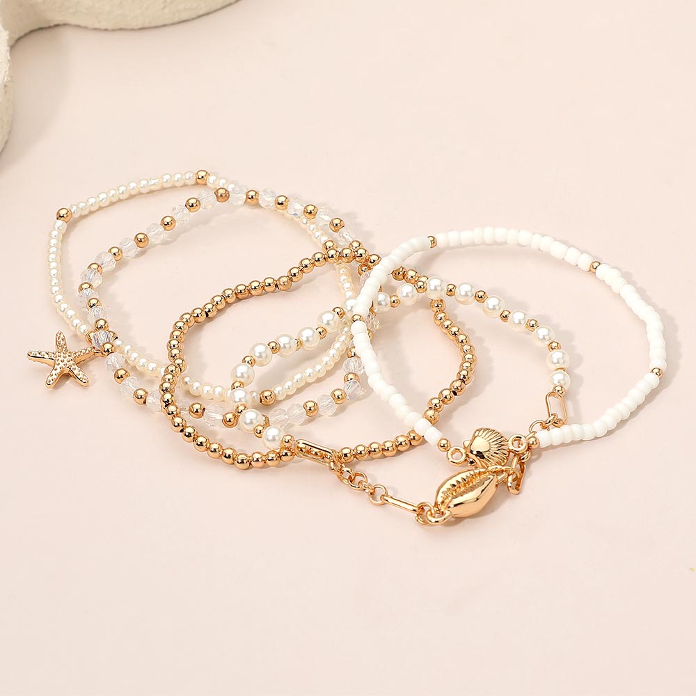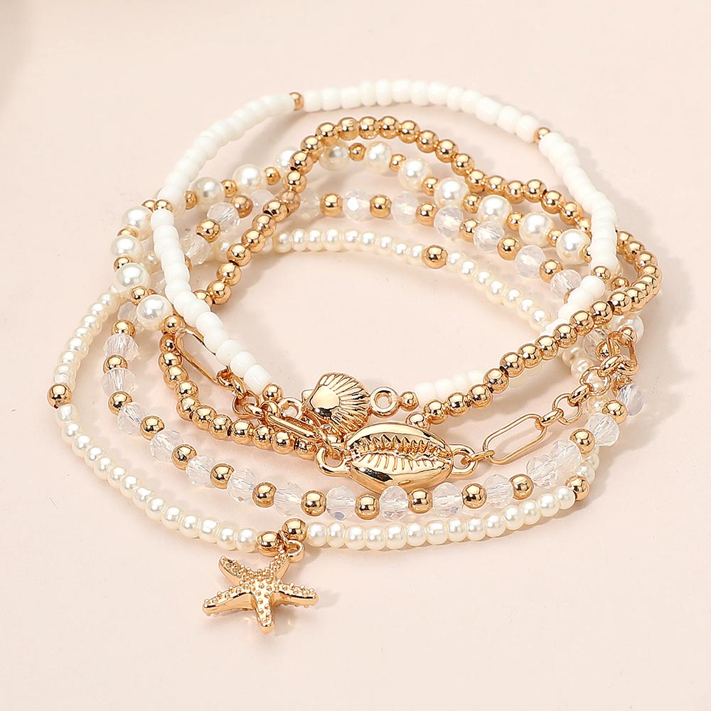 Details • Size : 0.75" H • Stretchable • Bring seaside elegance to your style with this Ocean Charm Beaded Layered Bracelet Set. Featuring shells, pearls, and starfish accents, this five-piece stack creates a playful coastal look. Ideal for adding a breezy, beach-inspired touch to casual or summer outfits. • Lead and Nickel Compliant