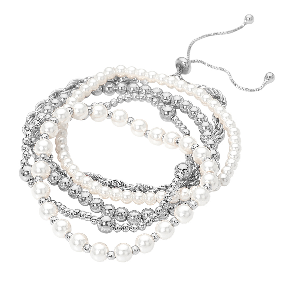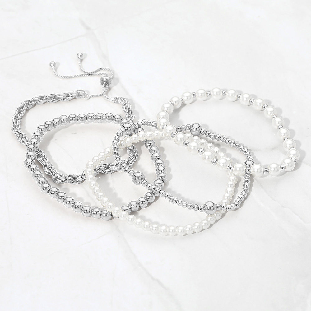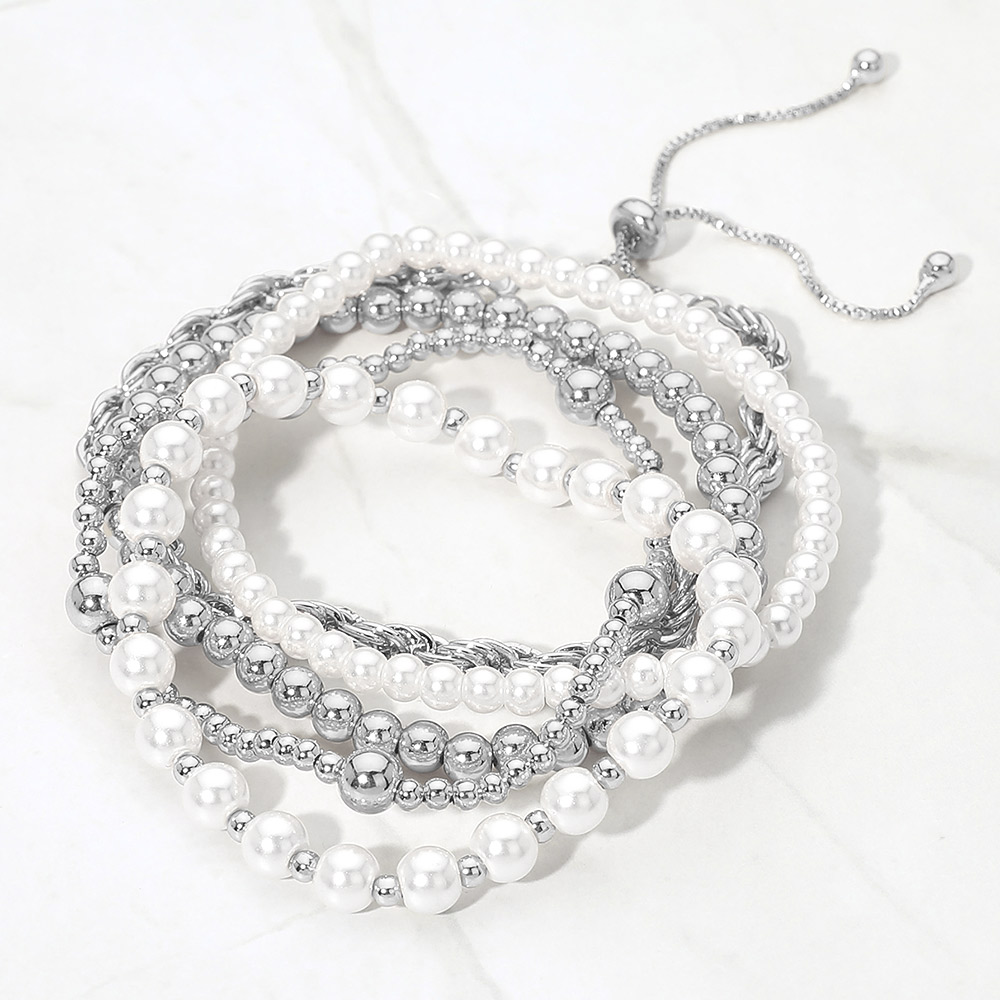 5PCS - Pearl Metal Beaded Twisted Chain Adjustable Stretch Multi Layered Bracelets