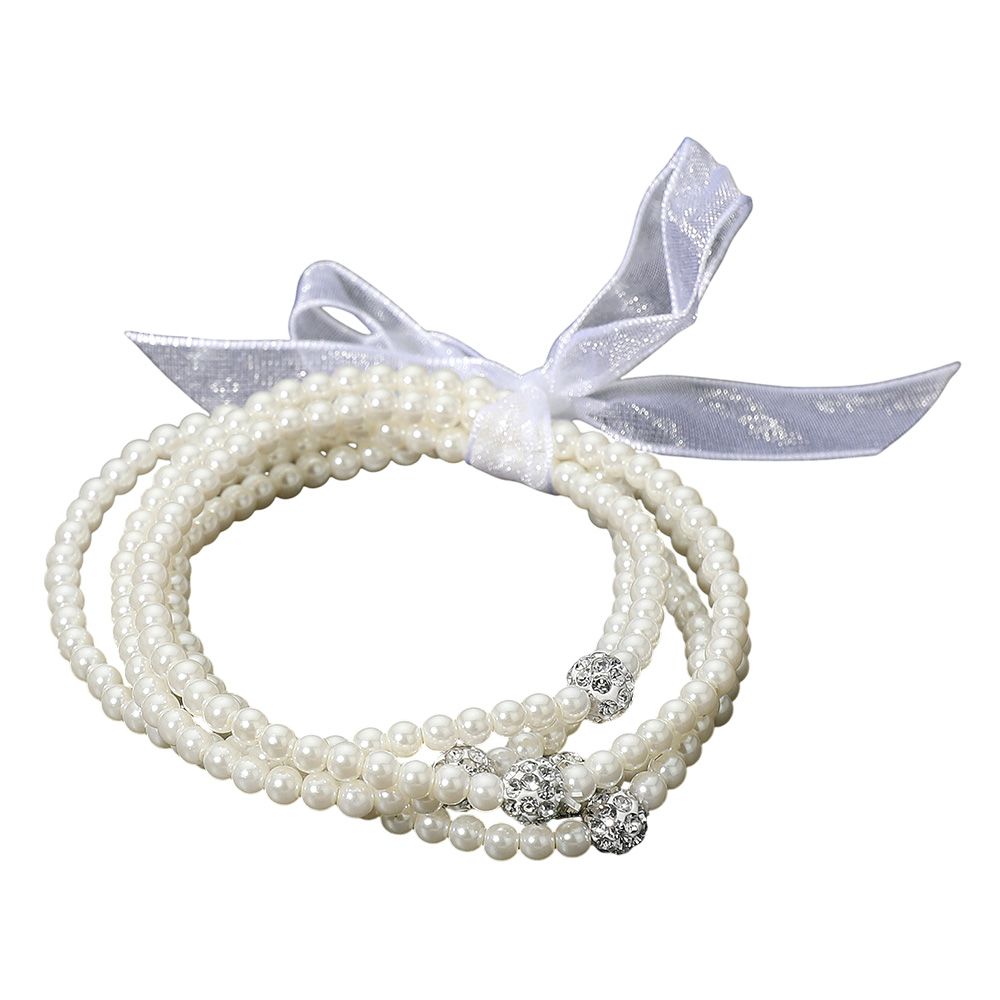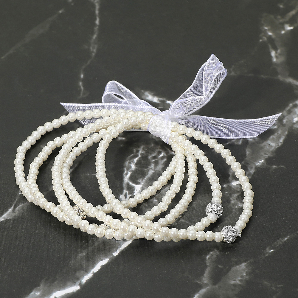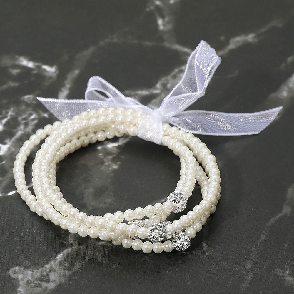 Details • Size : 1.2" H • Stretchable • Elevate your style with this multi-strand pearl bracelet, accented with sparkling crystal beads and finished with a delicate ribbon bow. Perfect for weddings, parties, and special occasions, this elegant bracelet combines classic charm with a touch of sparkle for a timeless accessory. • Lead and Nickel Compliant