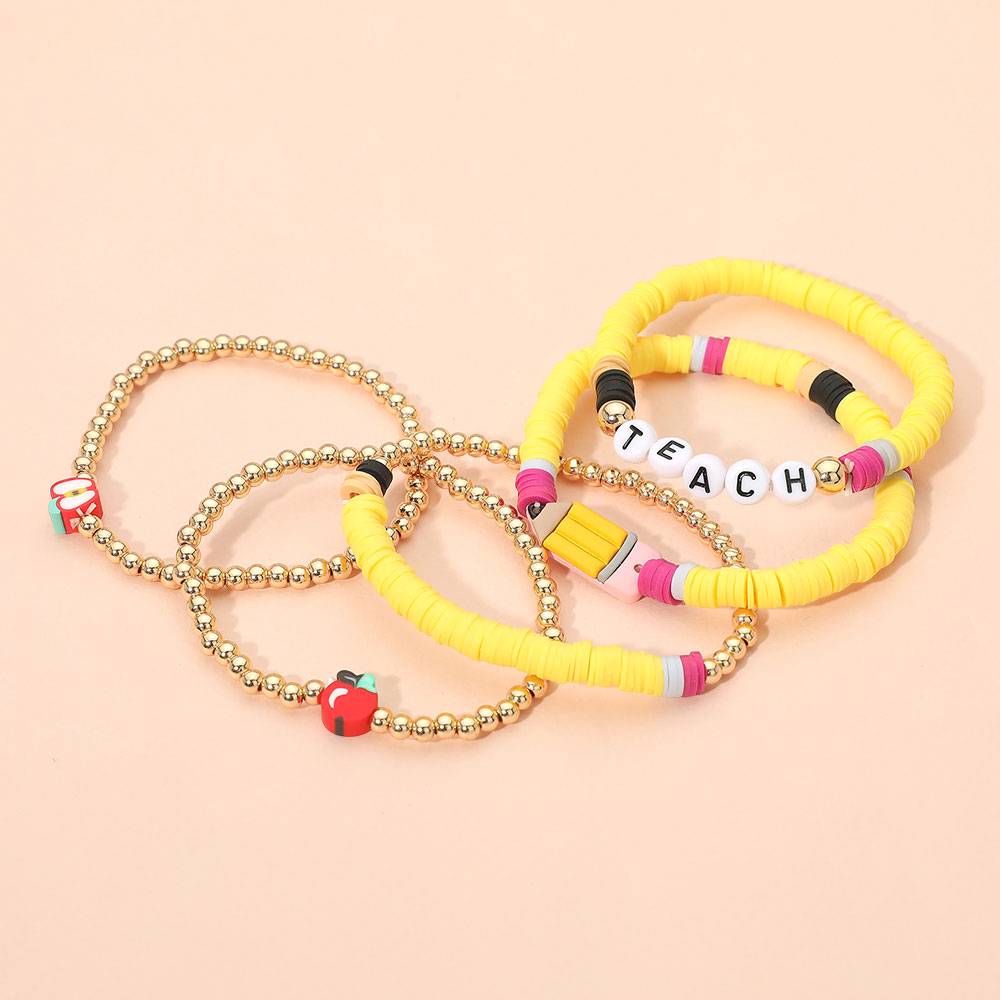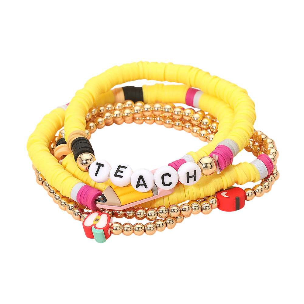 Details • Size : 1.5" H • Stretchable • Playful letter charm bracelet stack featuring a bold “TEACH” message with fun accent charms. Designed for everyday wear, gifting, and seasonal teacher appreciation moments. A cheerful accessory that adds personality, layered style, and meaningful detail to boutique bracelet collections. • Lead and Nickel Compliant