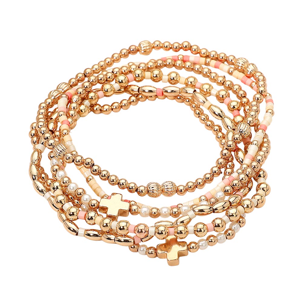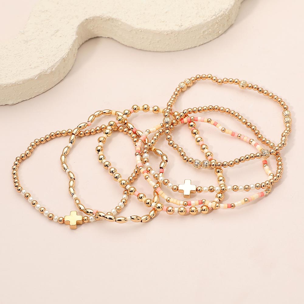 6PCS - Cross Charm Accent Seed Beaded Stretch Multi Layered Bracelets