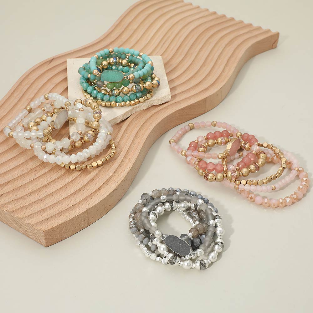 6PCS - Oval Druzy Charm Accent Faceted Beaded Stretch Multi Layered Bracelets