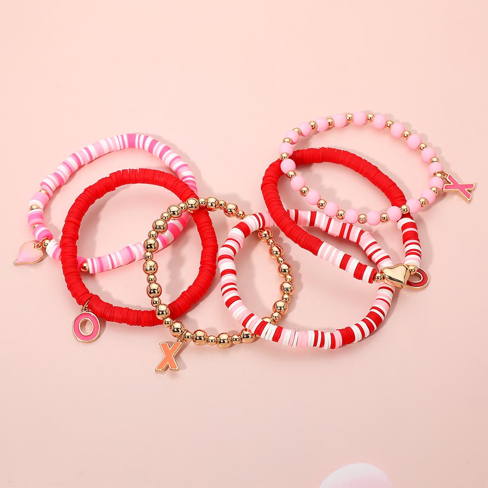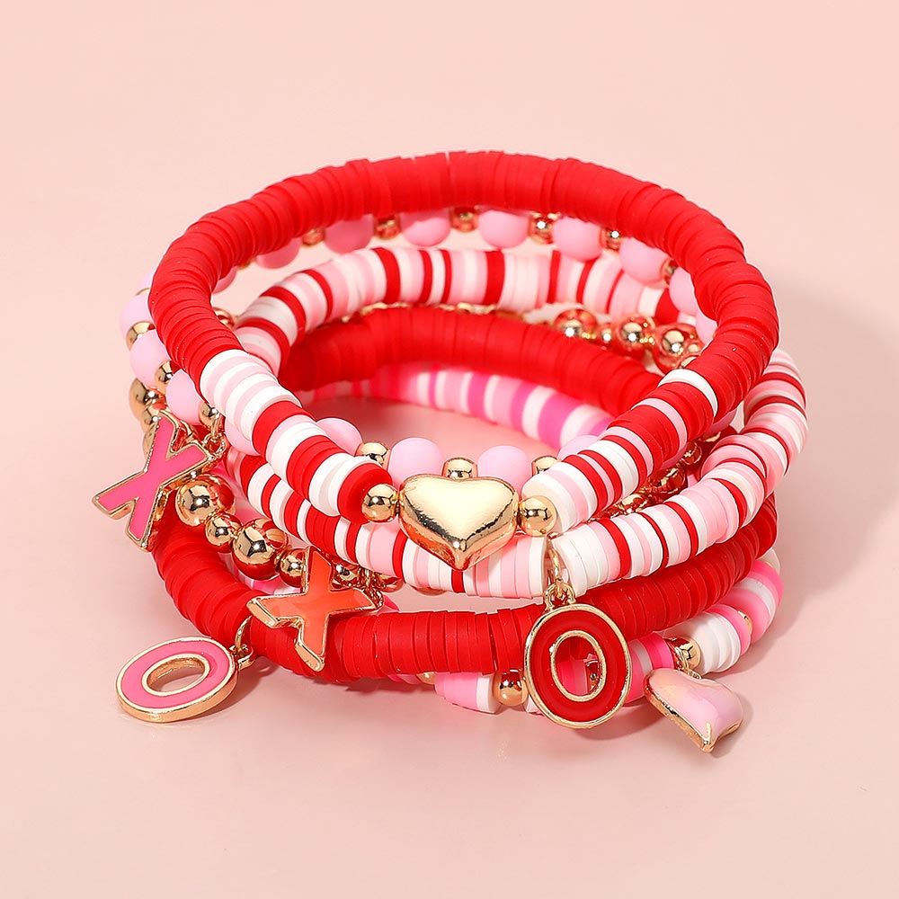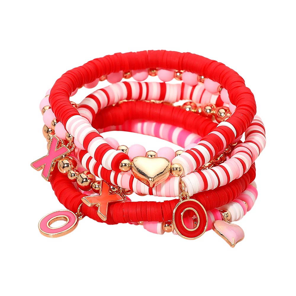 6PCS - Valentine Themed Heart XOXO Charm Heishi Beaded Stretch Multi Layered Bracelets
