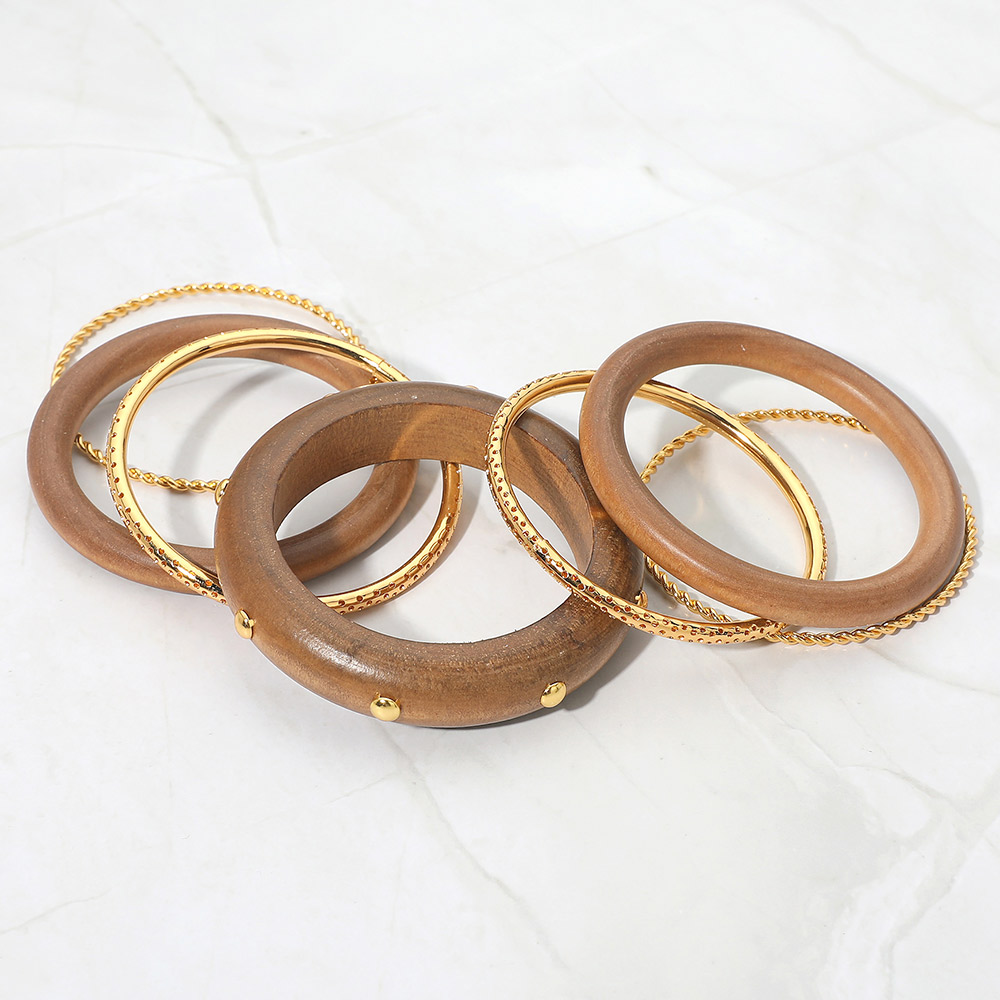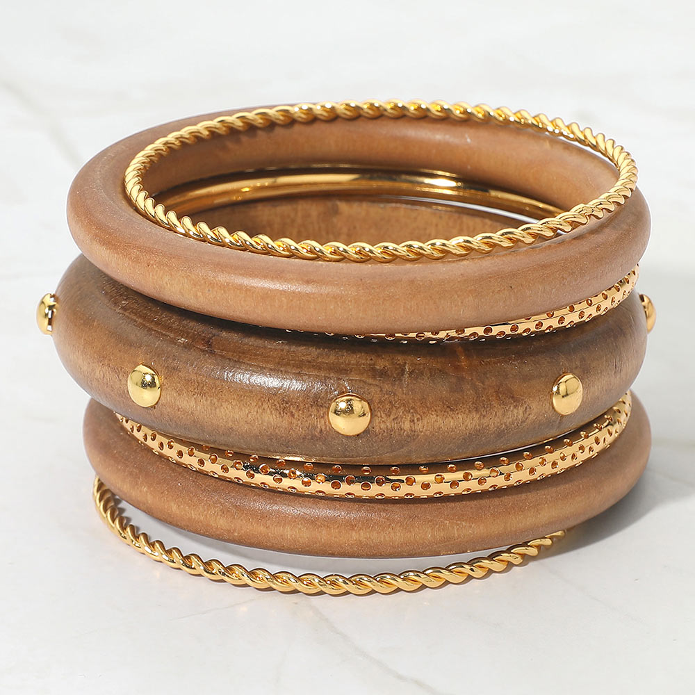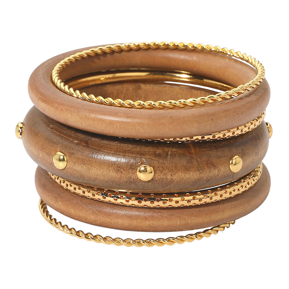 Details • Size : 2" H, 2.5" D • This statement bracelet set features a bold layered design with smooth rounded bands, textured details, and stud accents for a modern stacked look. Ideal for effortless styling, it elevates casual outfits, resort wear, and everyday looks while offering visual depth and easy mix-and-match appeal for trend-forward collections and gifting. • Lead and Nickel Compliant