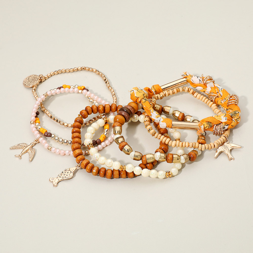 Details • Size 1 : 1.5" H / Stretchable • Size 2 : 0.5" H, 7" + 1.5" L / Lobster Clasp Closure • Boho charm bracelet set featuring layered beaded strands with fish and bird motifs, wood-style accents, fabric-wrapped details, and metallic highlights for a handcrafted artisanal look. Perfect for stacking, casual outfits, vacations, festivals, and gifting, adding a relaxed coastal vibe to everyday style. • Lead and Nickel Compliant • Made In India