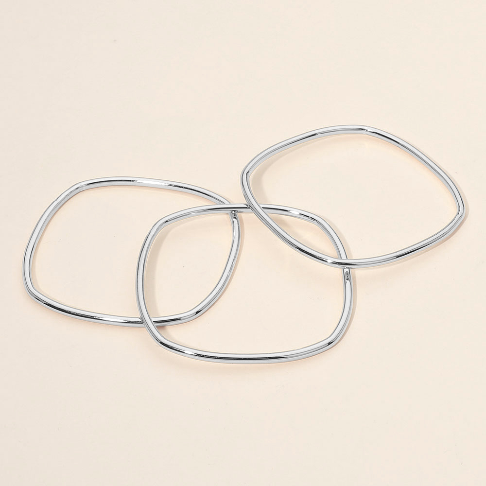 Details • Size : 0.4" H, 2.4" D • Water Resistant • Modern square shape stackable bangle set featuring three sleek geometric bangles designed for effortless layering or standalone wear. The clean structured silhouette adds a contemporary edge to everyday outfits, office looks, and evening styling, making this set a versatile jewelry essential. • Hypoallergenic • Stainless Steel