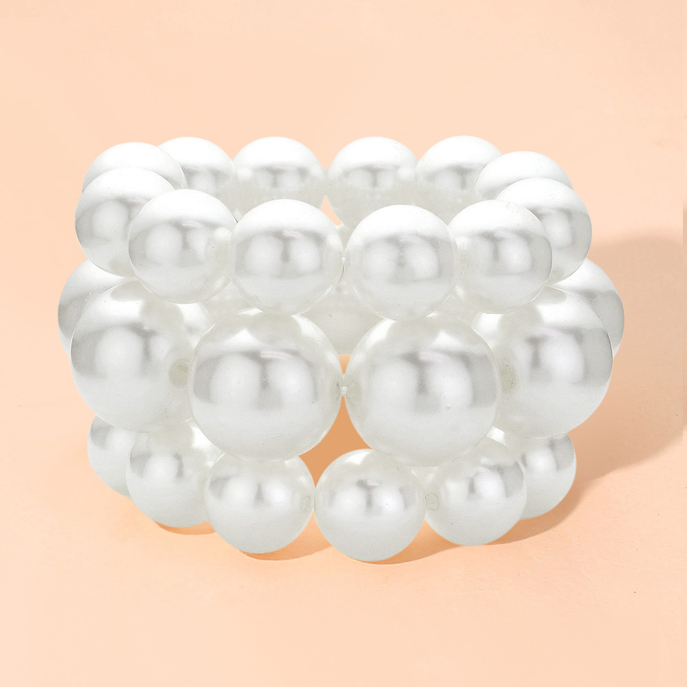 Details • Size : 2.25" H • Stretchable • Stylish wide stretch bracelet with triple rows of round pearl-like beads. Classic design that enhances formal outfits, parties, weddings, or everyday fashion with timeless elegance. • Lead and Nickel Compliant