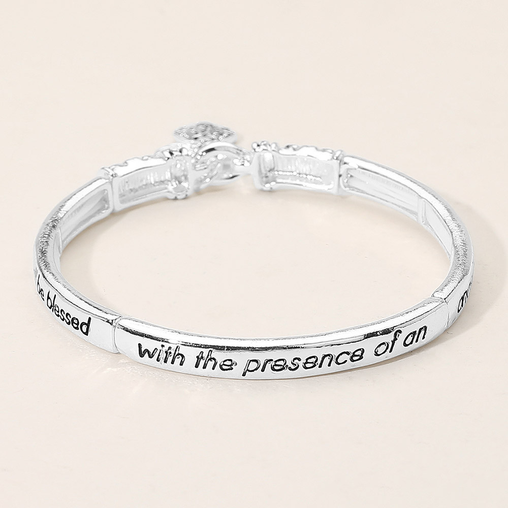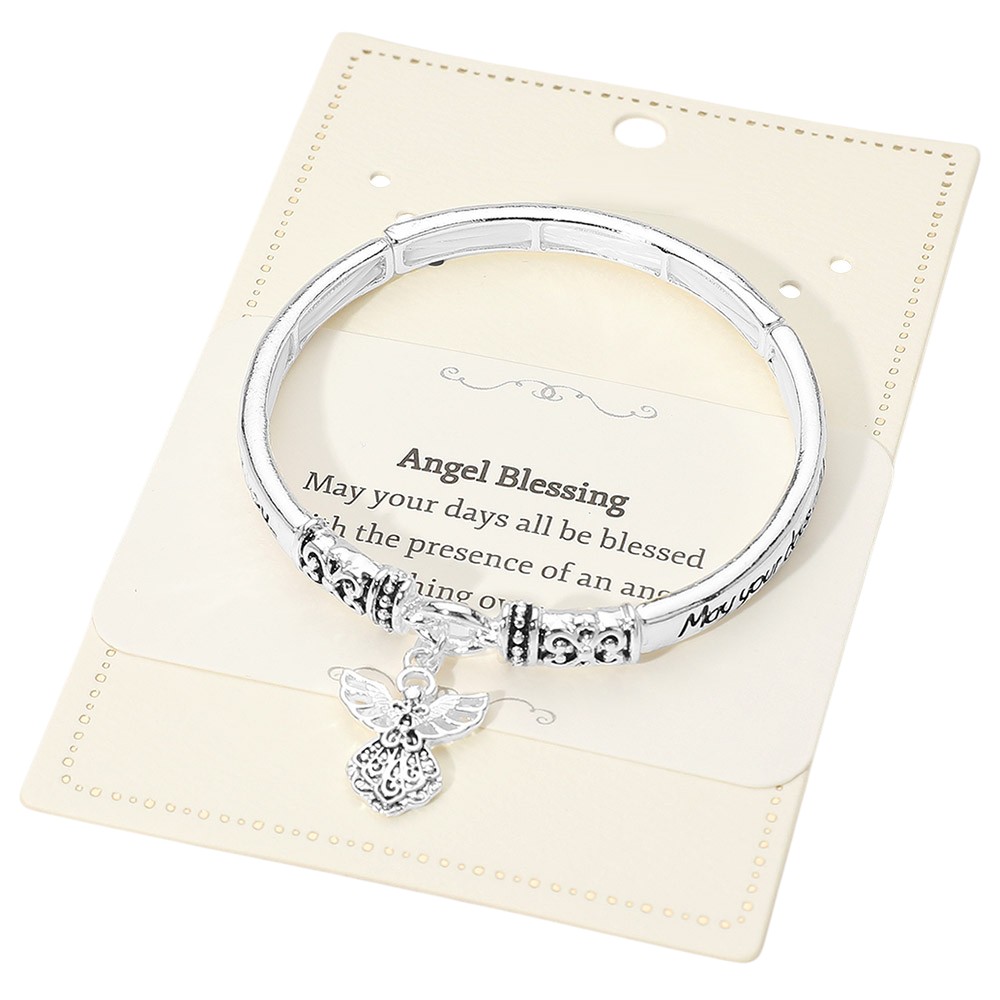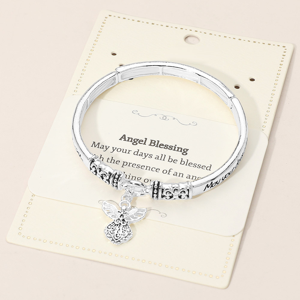 Details • Size : 0.25" H, 2.4" D • Charm Size : 0.75" L • Stretchable • Embrace protection and peace with this meaningful bangle bracelet featuring the Angel Blessing verse and a beautifully detailed angel charm. A heartfelt symbol of faith and grace, it serves as a daily reminder of divine guidance and makes a perfect gift for encouragement and love. • Lead and Nickel Compliant