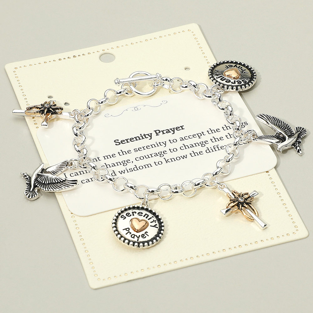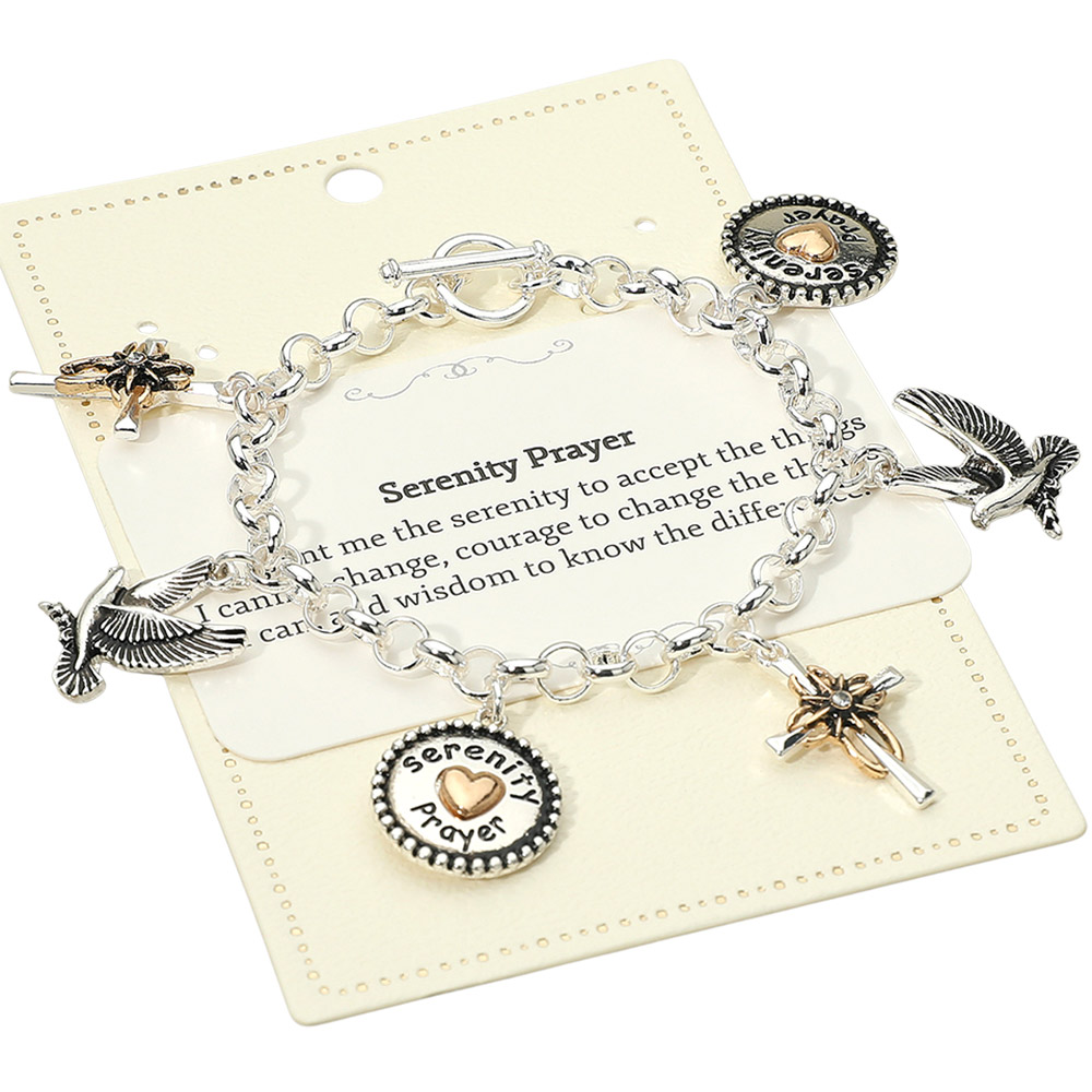 Details • Size : 1.1" H, 7.5" L • Toggle Closure • Embrace peace and faith with this Serenity Prayer charm bracelet, featuring symbolic charms of hope and devotion. The engraved message inspires courage and wisdom, making it a meaningful accessory or thoughtful gift for anyone seeking daily encouragement and spiritual strength. • Lead and Nickel Compliant