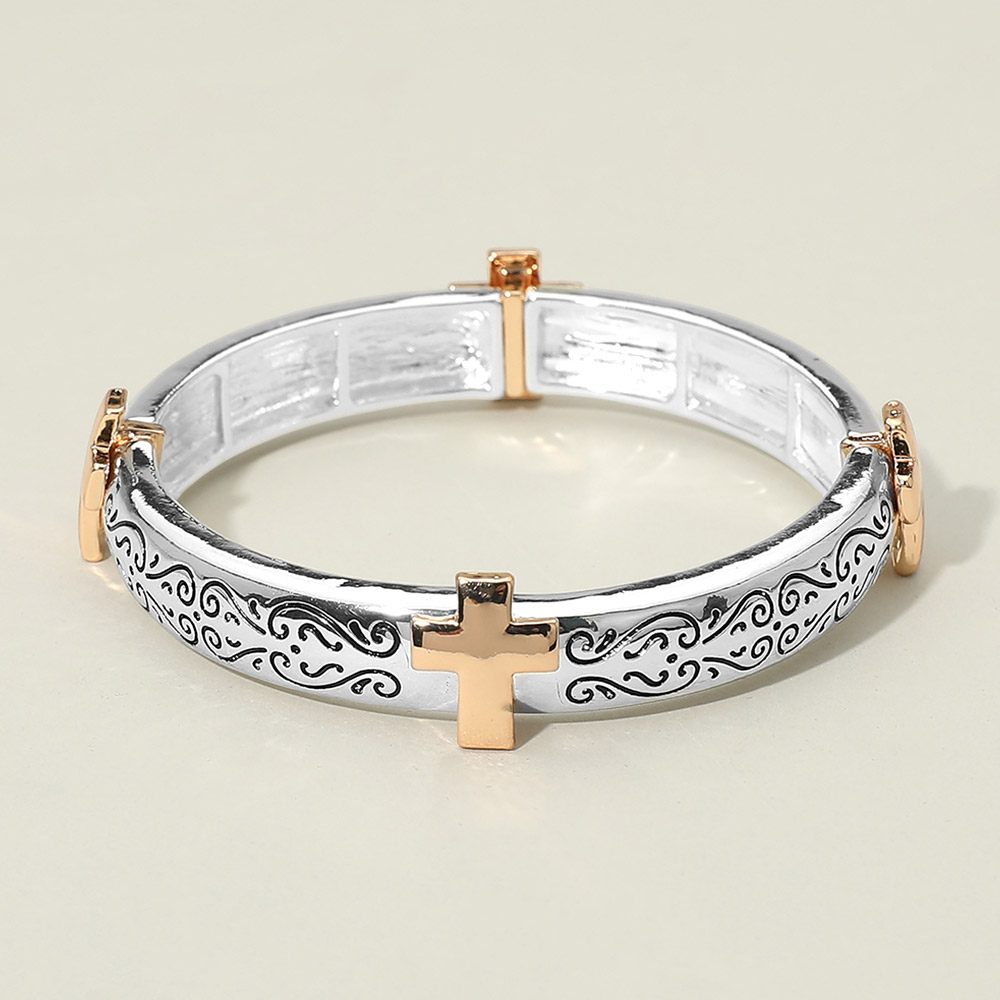 Details • Size : 0.6" H • Stretchable • Elegant hinged bangle bracelet featuring engraved swirl detailing and cross accents for a timeless, faith-inspired look. Designed for easy wear and a secure fit, this bracelet is ideal for everyday styling, gifting, and boutique jewelry collections. • Lead and Nickel Compliant