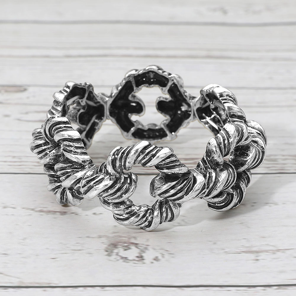 • Bold twisted link stretch bracelet featuring a sculpted rope-inspired design that adds texture and character to any look. The flexible fit offers comfortable wear while the dimensional links create a statement style perfect for everyday outfits or layered fashion. A strong choice for boutiques seeking distinctive, trend-forward accessories.