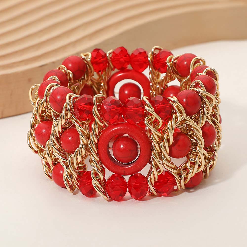 • Bold stretch bracelet designed with layered beads, faceted accents, and interlinked chain details for a dimensional statement look. Comfortable elastic fit allows easy wear while adding texture and shine to everyday or evening styling. Ideal for boutique collections, gifting, event styling, and trend-focused accessory assortments seeking eye-catching yet wearable designs.