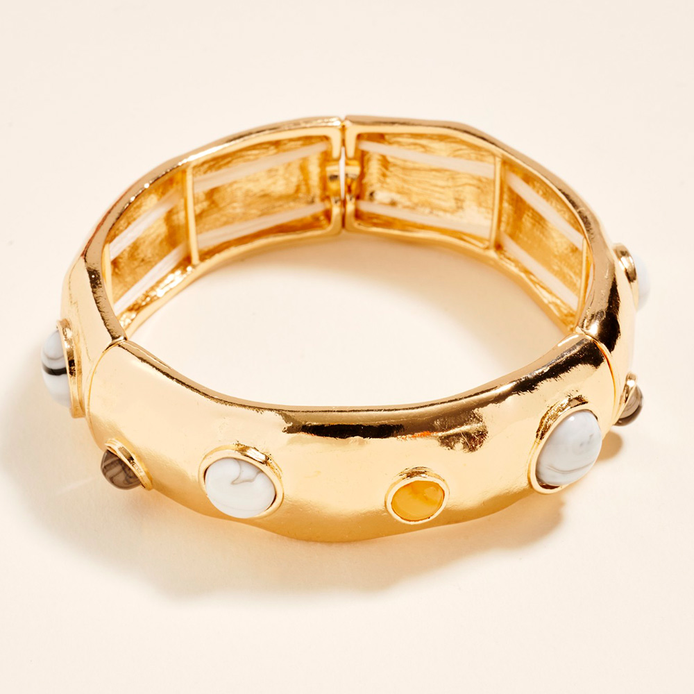 Details • Size : 0.75" h • Stretchable • This textured stretch bangle bracelet features a bold rounded silhouette accented with smooth cabochon-style details for a modern statement look. Designed for easy slip-on wear and comfortable fit, it adds dimension and shine to everyday outfits. Perfect for stacking or wearing solo, this bracelet brings fashion-forward appeal to casual and dress-ready styles alike. • Lead and Nickel Compliant