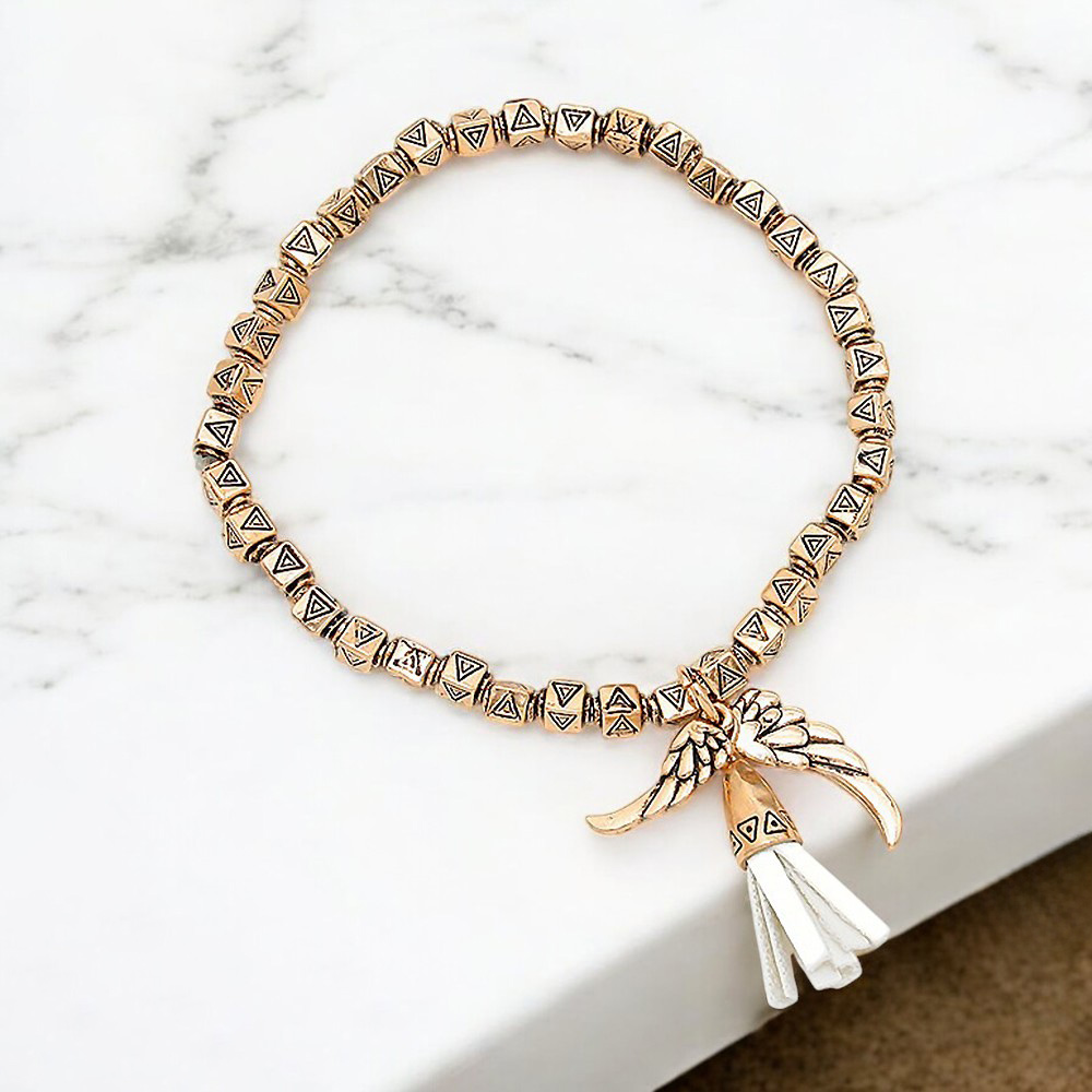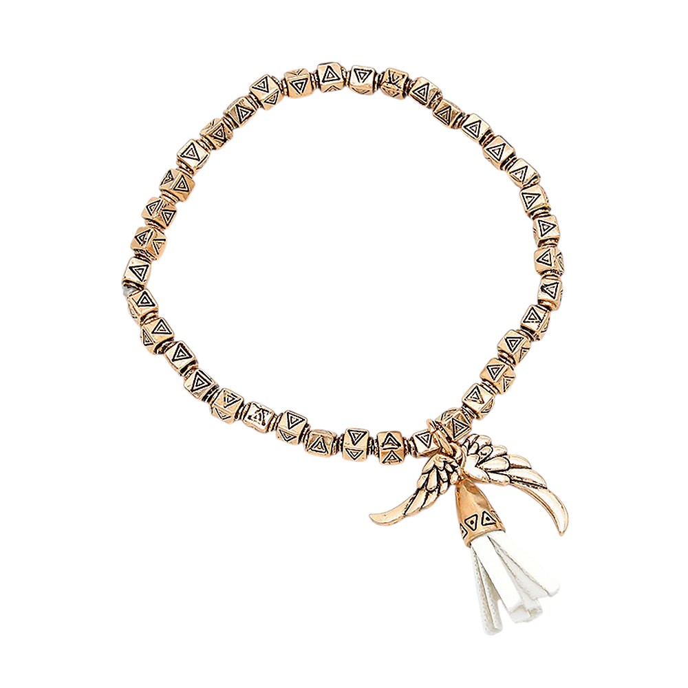 Faux suede tassel & wing charm aztec metal bead stretch bracelet
