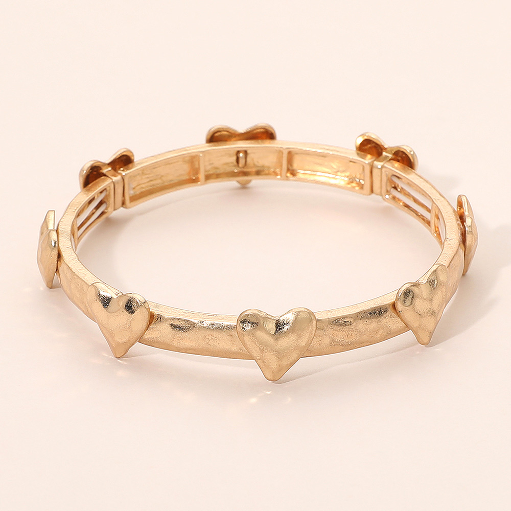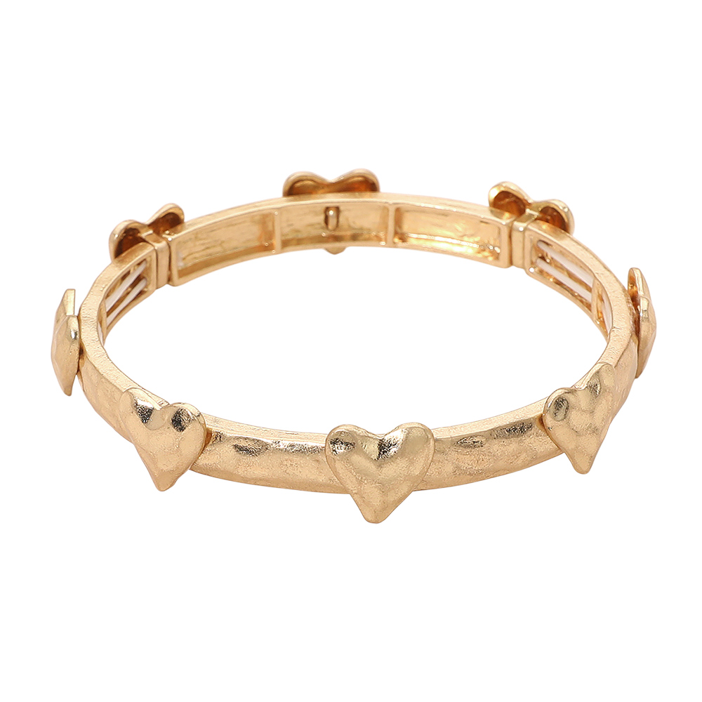 Details • Size : 0.5" H, 2.5" D • Stretchable • A stylish stretch hammered brushed metal bracelet featuring raised heart accents that bring a playful, modern touch to any look. Its flexible design ensures an easy, comfortable fit while adding a sweet statement to casual or dressed-up outfits. Perfect for gifting or completing your jewelry collection. • Lead and Nickel Compliant